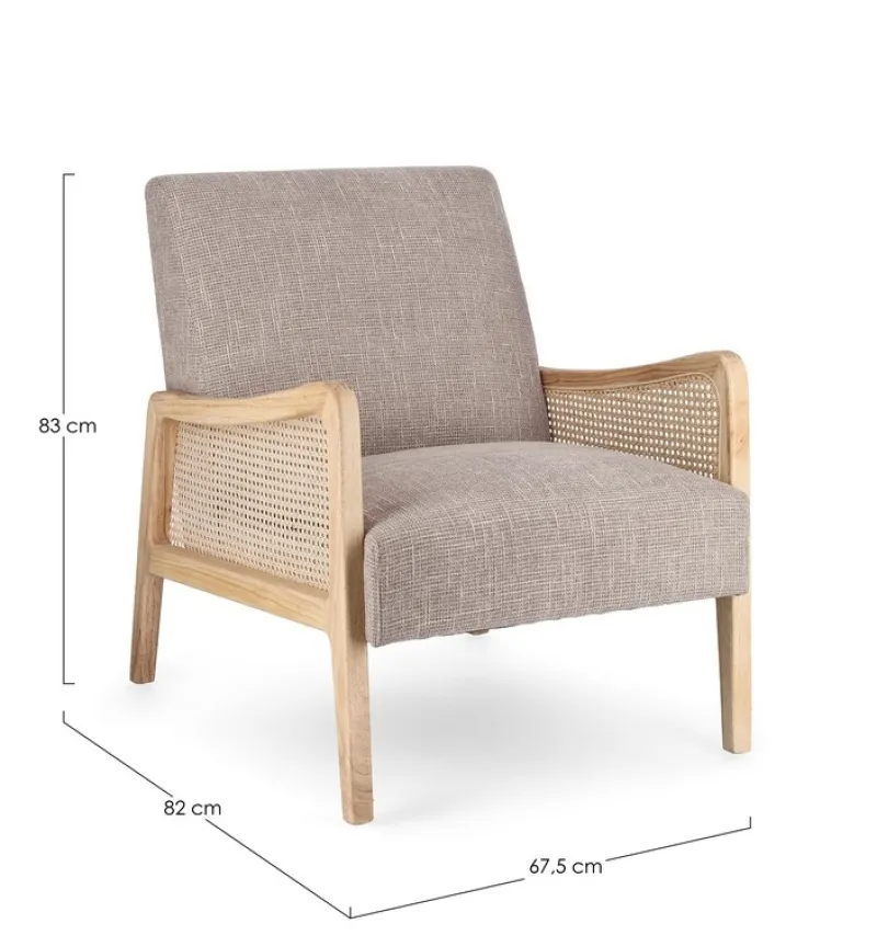 STRUTTURA IN LEGNO DI PINO E COMPENSATO. GAMBE IN RUBBERWOOD. BRACCIOLI CON INSERTI IN RATTAN. RIVESTIMENTO IN POLIESTERE. DENSITA’ IMBOTTITURA IN SCHIUMA POLIURETANICA 24 KG/M3. NON SFODERABILE. GAMBE DA ASSEMBLARE.