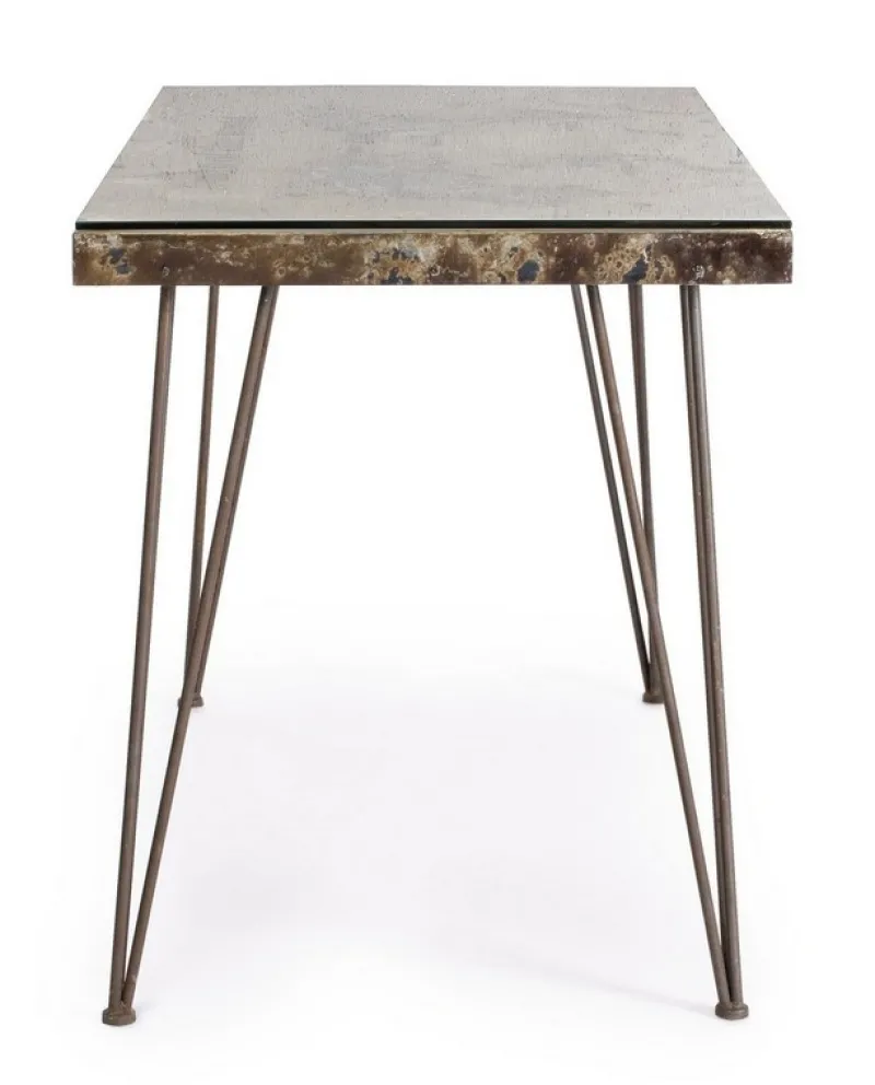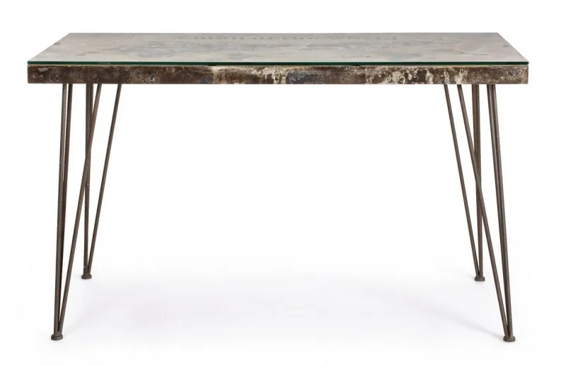 STRUTTURA IN ACCIAIO ANTICATO, PIANO IN VETRO E MDF CON DECORAZIONE IN CEMENTO. GAMBE DA ASSEMBLARE.