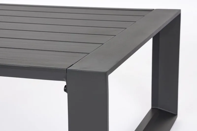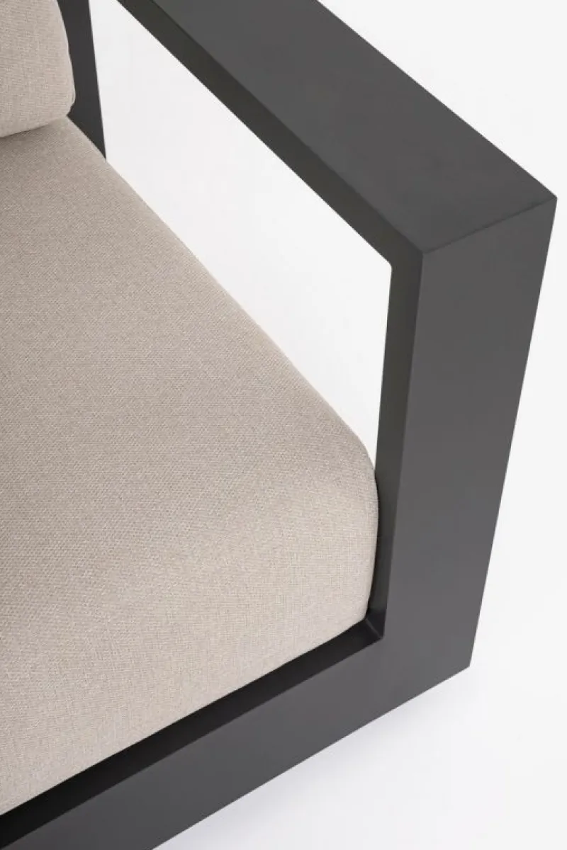 STRUTTURA IN ALLUMINIO VERNICIATO A POLVERE (POLIESTERE). CUSCINI SEDUTA E SCHIENALE SFODERABILI CON TESSUTO IDROREPELLENTE OLEFIN (100% POLIPROPILENE). PIEDINI REGOLABILI. GAMBE TAVOLINO (VITERIA IN ACCIAIO INOSSIDABILE) DA ASSEMBLARE.