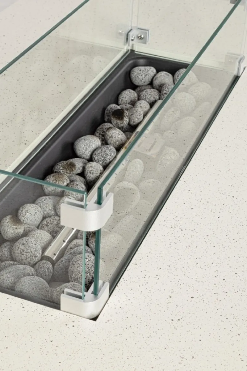 STRUTTURA IN ACCIAIO VERNICIATO (SPESSORE 0,8 MM). PARAVENTO PER CAMINO IN VETRO (SPESSORE 5 MM), VETRO REMOVIBILE. MISURE VETRO 55,8 X 15,7 X 14 CM. BRUCIATORE: Ø38 CM. PROVVISTO DI COPERCHIO IN ACCIAIO VERNICIATO PER COPRIRE L’ARTICOLO QUANDO NON E’ IN USO. COMPLETO DI SASSI DECORATIVI IN ROCCIA LAVICA COLORE GRIGIO SCURO. PROVVISTO DI COPERTURA IN TELO NERO PER COPRIRE