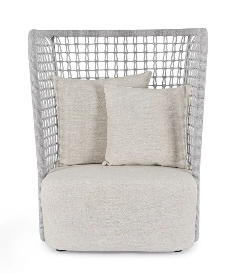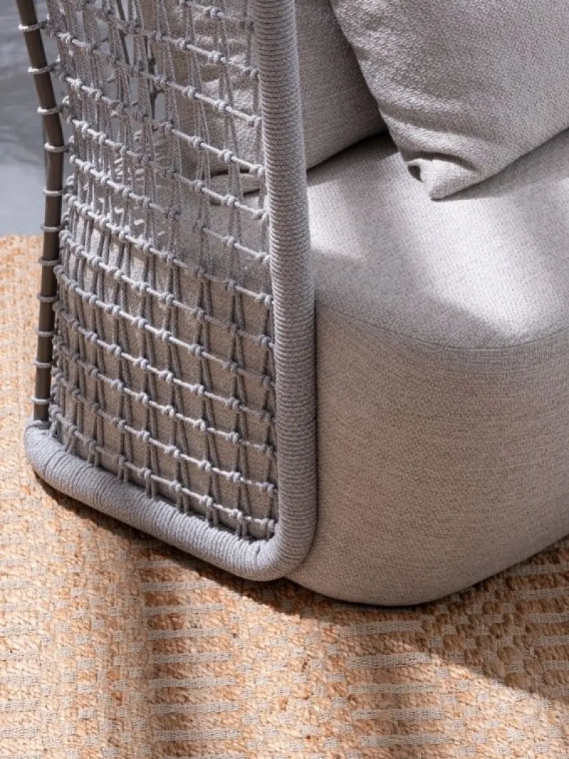 STRUTTURA IN ALLUMINIO VERNICIATO A POLVERE (POLIESTERE). INTRECCIO IN CORDA OLEFIN (100% POLIPROPILENE). SEDUTA CON IMBOTTITURA IMPERMEABILE, RIVESTIMENTO NON SFODERABILE IN TESSUTO PER ESTERNO OLEFIN (100% POLIPROPILENE) IDROREPELLENTE E RESISTENTE AI RAGGI UV (GRADO 7). CUSCINO SCHIENALE SFODERABILE IN TESSUTO IDROREPELLENTE OLEFIN (100% POLIPROPILENE).