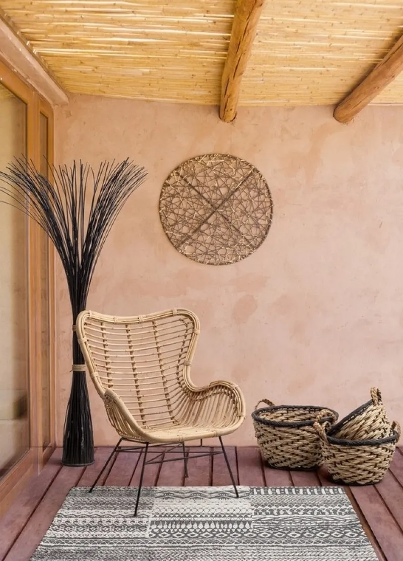 STRUTTURA IN RATTAN, RIFINITURA CON VERNICE MELAMINICA. GAMBE IN ACCIAIO VERNICIATE A POLVERE. SI RACCOMANDA DI NON ESPORRE ALLA LUCE DIRETTA DEL SOLE ED ALLE INTEMPERIE. GAMBE DA ASSEMBLARE.