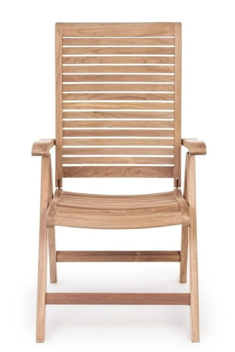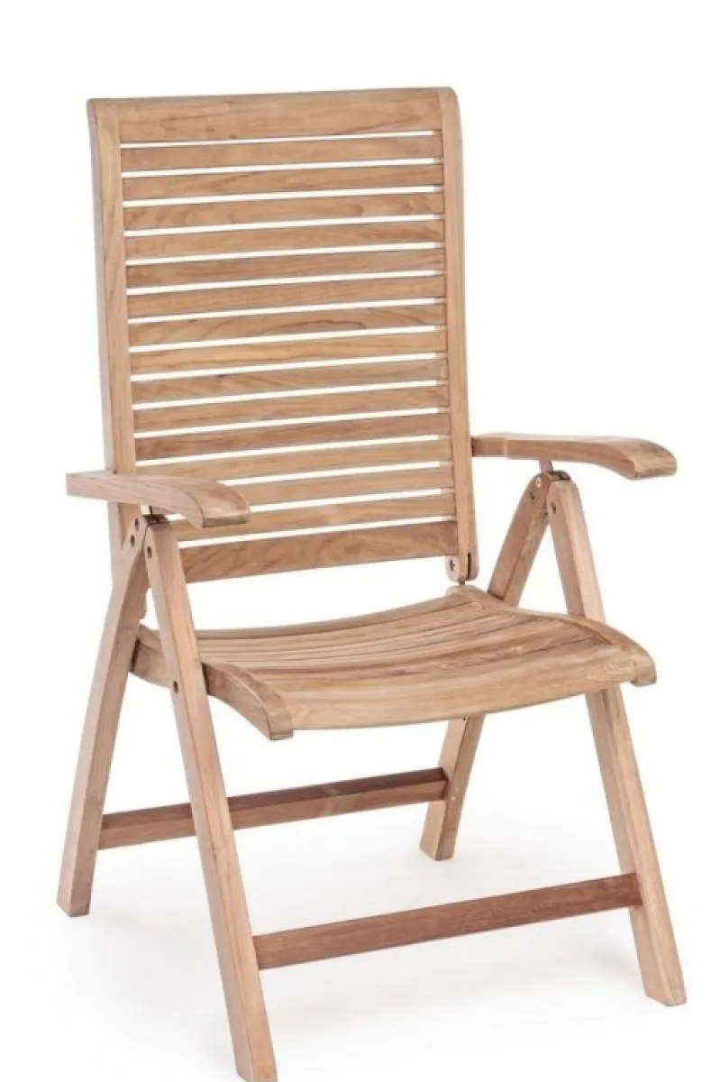 LEGNO TEAK (CLASSE A) – SVLK (LEGNO CERTIFICATO PROVENIENTE DA FORESTE SOSTENIBILI), PRODUZIONE MECCANICA. FERRAMENTA IN ACCIAIO GALVANIZZATO. SCHIENALE RECLINABILE (5 POSIZIONI). PIEGHEVOLE.