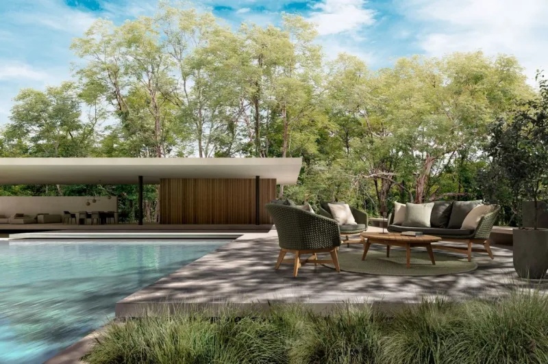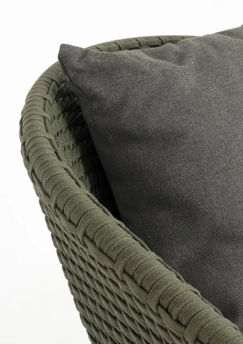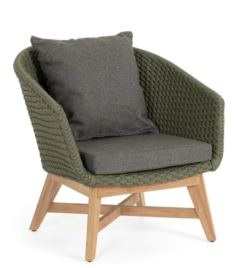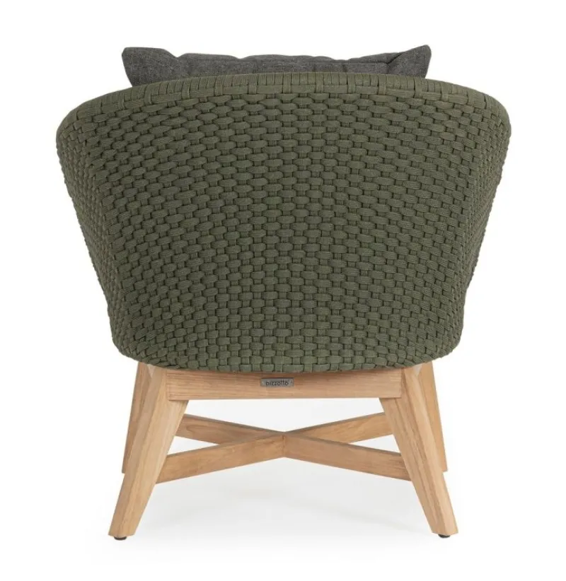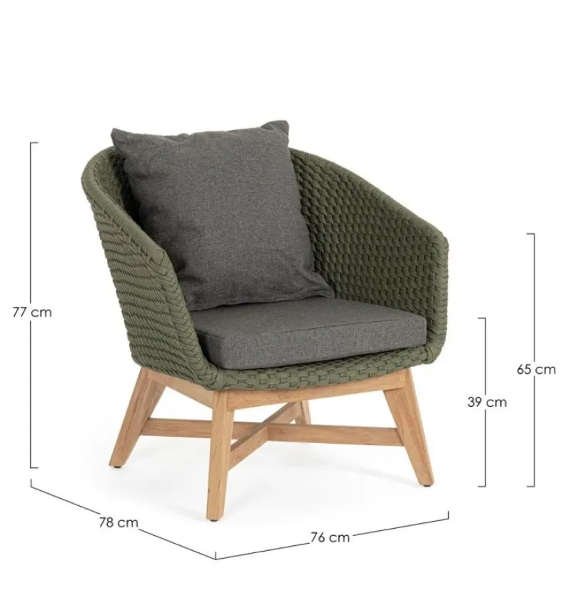 SEDUTA CON STRUTTURA IN ALLUMINIO VERNICIATA A POLVERE (POLIESTERE). INTRECCIO IN CORDA OLEFIN (100% POLIPROPILENE). CUSCINO SEDUTA E SCHIENALE SFODERABILE CON TESSUTO IDROREPELLENTE SUNPROOF OLEFIN (100% POLIPROPILENE). GAMBE IN TEAK – SVLK (LEGNO CERTIFICATO PROVENIENTE DA FORESTE SOSTENIBILI). VITERIA IN ACCIAIO GALVANIZZATO. GAMBE DA ASSEMBLARE. ATTENZIONE: PRIMA DI PROCEDERE AL MONTAGGIO, ASSICURARSI CHE LA NUMERAZIONE SEDUTA-GAMBE COINCIDA.
