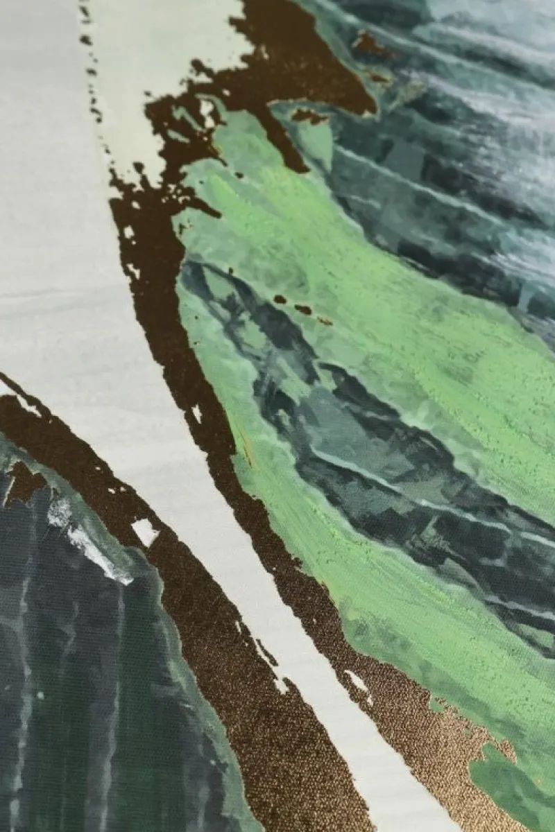 STAMPA SU TELA CON FINITURE FATTE A MANO E CON APPLICAZIONI DI FOGLI DORATI.