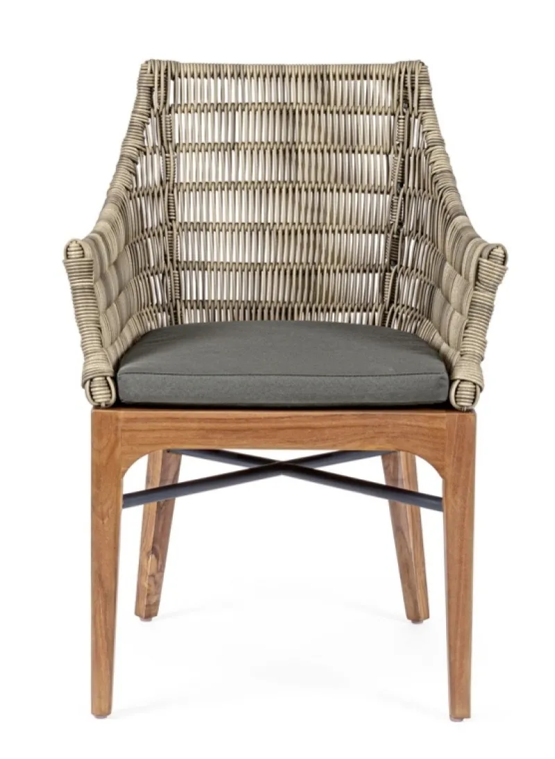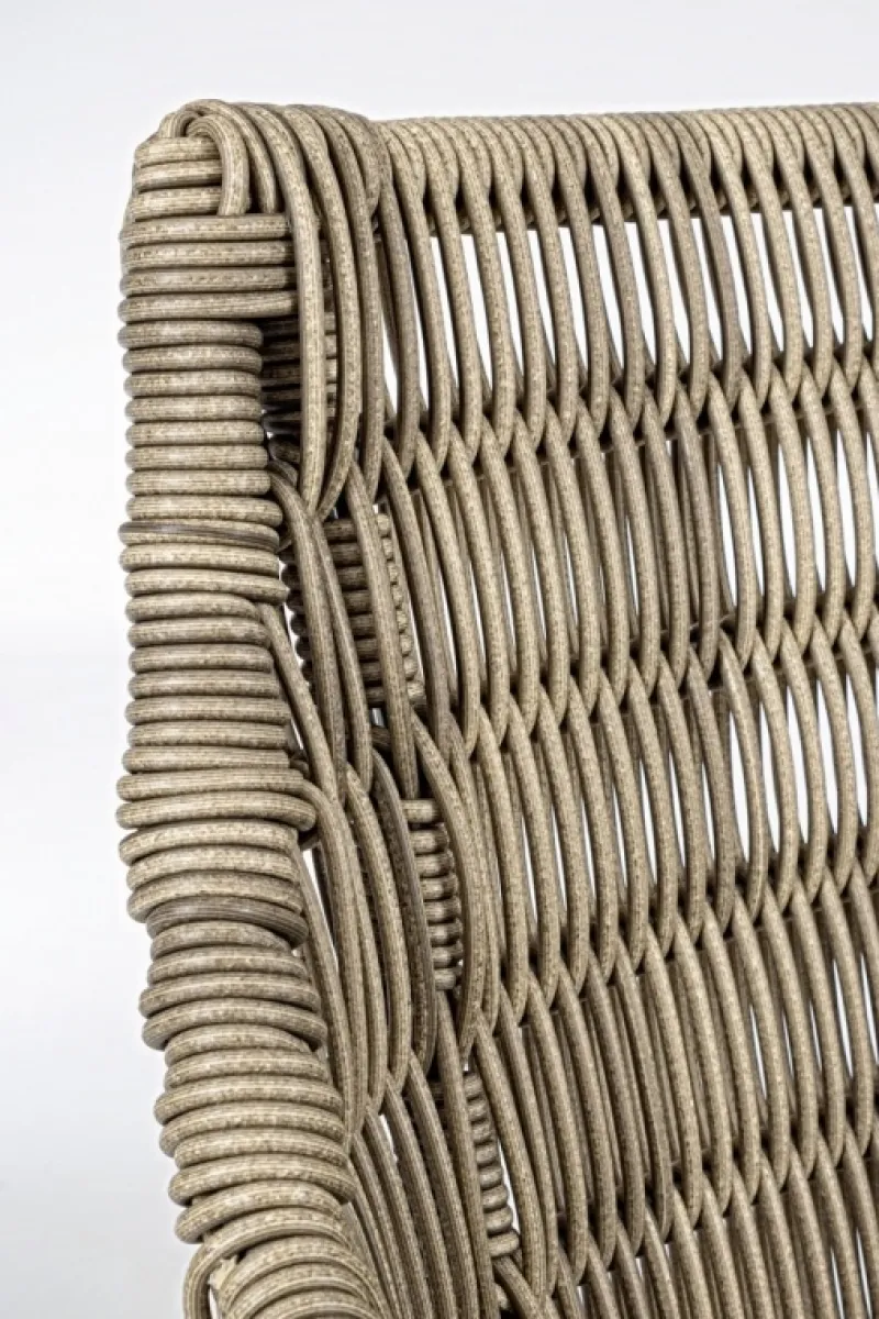 STRUTTURA SCHIENALE IN ALLUMINIO VERNICIATO A POLVERE (POLIESTERE). SEDUTA E GAMBE IN TEAK – SVLK (LEGNO CERTIFICATO PROVENIENTE DA FORESTE SOSTENIBILI). INTRECCIO PER ESTERNO IN FIBRA SINTETICA TONDA 5MM. CUSCINO SFODERABILI IN TESSUTO SUNPROOF OLEFIN (100% POLIPROPILENE). IMBOTTITURA PER ESTERNO “QUICK DRY FOAM” (ANTIUMIDITA’).