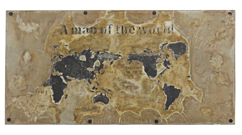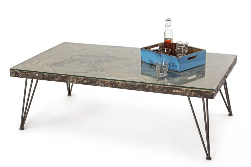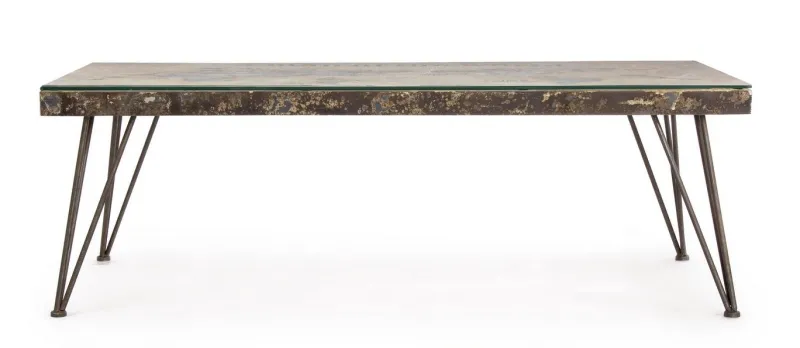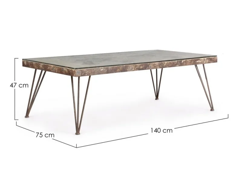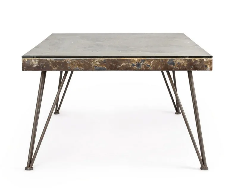 STRUTTURA IN ACCIAIO ANTICATO, PIANO IN VETRO E MDF CON DECORAZIONE IN CEMENTO. GAMBE DA ASSEMBLARE.