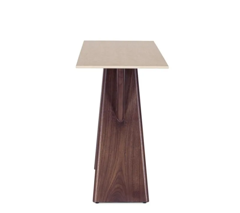 PIANO IN GRES PORCELLANATO CON EFFETTO TRAVERTINO. SUPPORTO PIANO IN ACCIAIO VERNICIATO A POLVERE EPOSSIDICA. GAMBE IN COMPENSATO IMPIALLACCIATO LEGNO DI NOCE. GAMBE DA ASSEMBLARE.