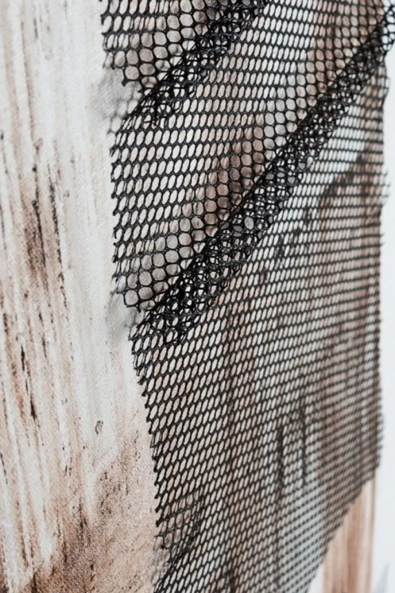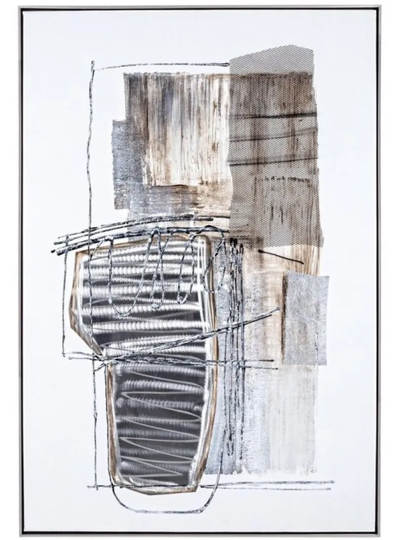 DIPINTO SU TELA CON APPLICAZIONI METALLICHE, STRUTTURA IN LEGNO DI ABETE. CORNICE IN PLASTICA.