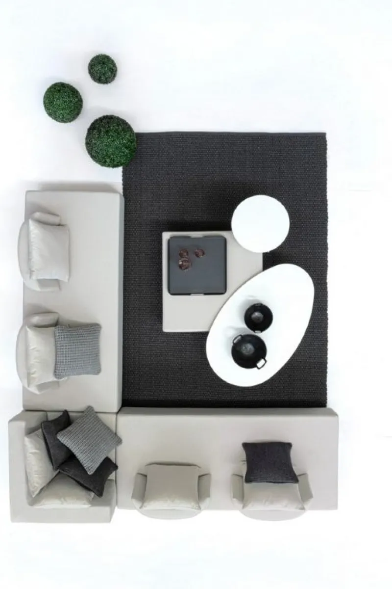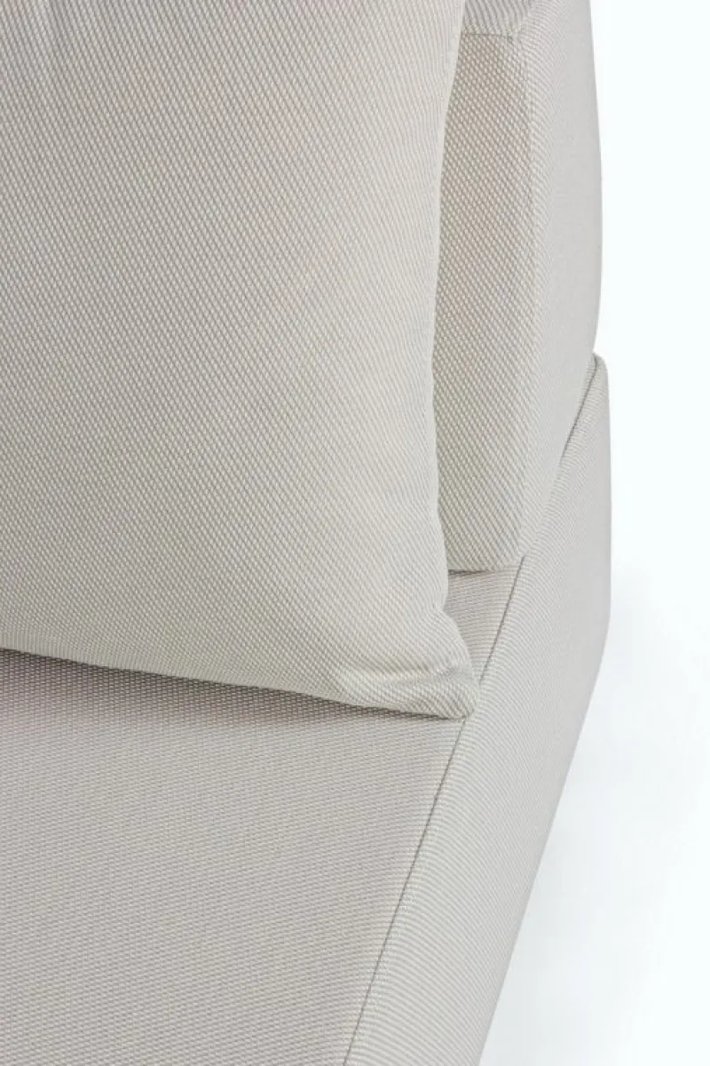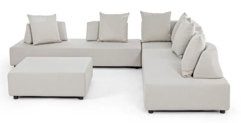 DIVANI E OTTOMAN CON STRUTTURA IN ALLUMINIO. SCHIENALI REMOVIBILI CON STRUTTURA IN ACCIAIO, GALVANIZZATA A CALDO E VERNICIATA A POLVERE (POLIESTERE). SEDUTE, SCHIENALI E CUSCINI SFODERABILI IN TESSUTO PER ESTERNO IN OLEFIN (100% POLIPROPILENE, 285G/M2), IDROREPELLENTE E RESISTENTE AI RAGGI UV (GRADO 7), IMPERMEABILIZZATO INTERNAMENTE CON RIVESTIMENTO IN TESSUTO