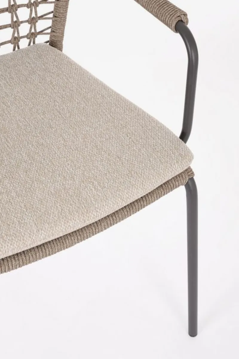 STRUTTURA IN ACCIAIO INOSSIDABILE (201). INTRECCIO PER ESTERNO IN CORDA (POLIPROPILENE). CUSCINI SFODERABILI IN TESSUTO IDROREPELLENTE SUNPROOF OLEFIN (100%POLYPROPYLENE). IMPILABILE.