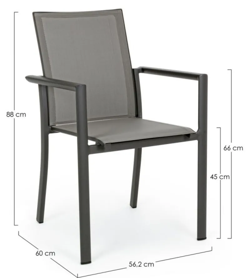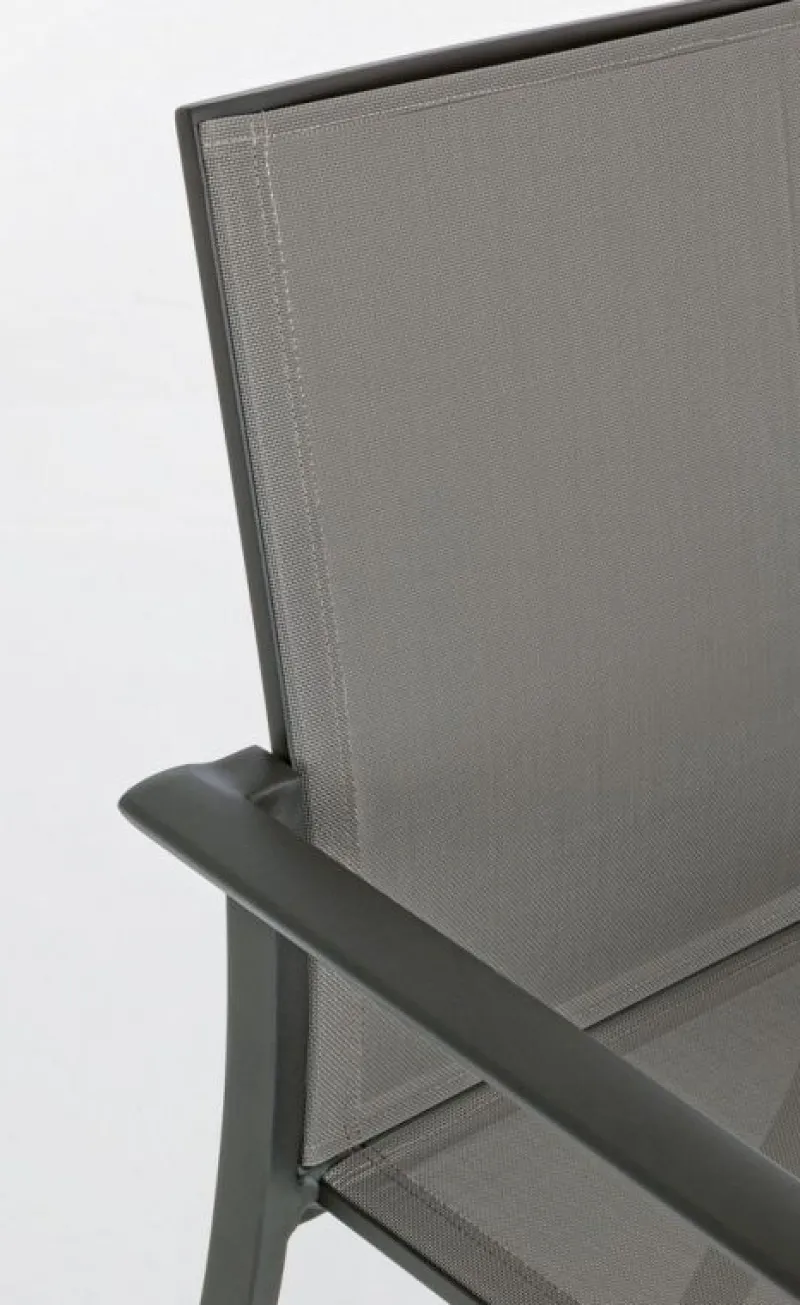 STRUTTURA IN ALLUMINIO, VERNICIATO A POLVERE (POLIESTERE). SEDUTA E SCHIENALE IN TEXTILENE 1X1. IMPILABILE.