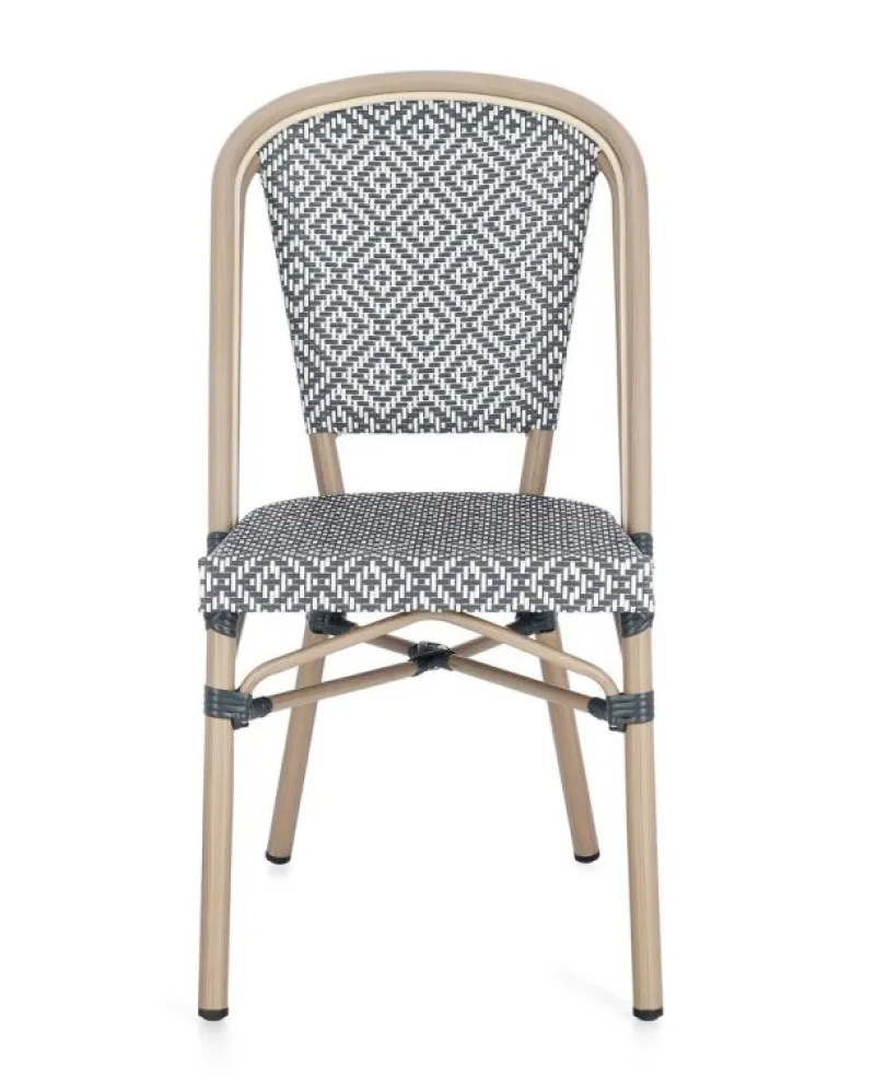 STRUTTURA IN ALLUMINIO VERNICIATA A POLVERE (POLIESTERE), EFFETTO NATURALE. SEDUTA E SCHIENALE IN TEXTILENE. IMPILABILE. IMBALLO SENZA CARTONE.