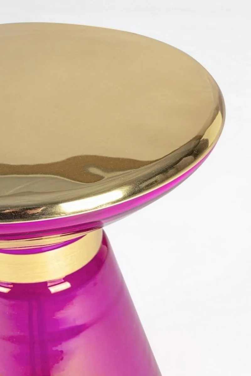 STRUTTURA IN VETRO CON ANELLO DECORATIVO E PIANO RIVESTITO IN ACCIAIO PLACCATO OTTONE, COLORE ORO.