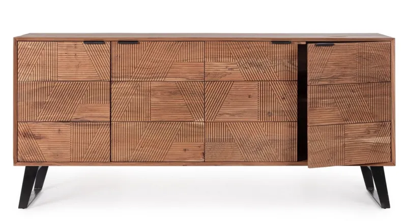 STRUTTURA IN LEGNO DI ACACIA, SCHIENALI IN COMPENSATO. FRONTALI ANTE INTARSIATI E LAVORATI A MANO. FINITURA ACRILICA PROTETTIVA. MANIGLIE E GAMBE IN ACCIAIO. GAMBE DA ASSEMBLARE.