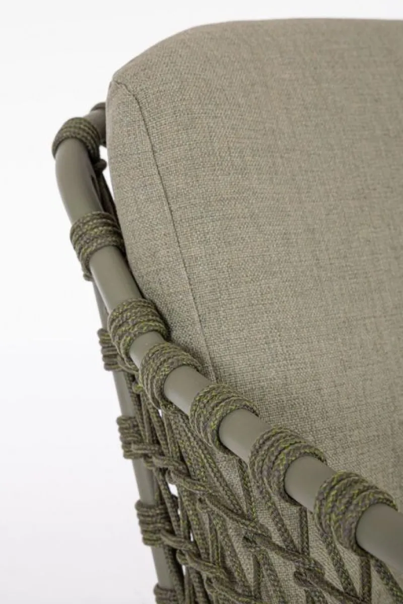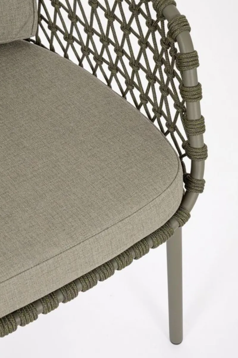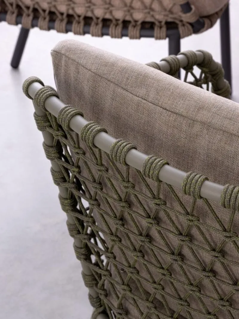 STRUTTURA IN ACCIAIO INOSSIDABILE (201). INTRECCIO PER ESTERNO IN CORDA (POLIPROPILENE). CUSCINI SFODERABILI IN TESSUTO IDROREPELLENTE SUNPROOF OLEFIN (100%POLYPROPYLENE).