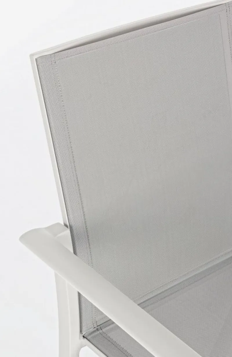 STRUTTURA IN ALLUMINIO, VERNICIATO A POLVERE (POLIESTERE). SEDUTA E SCHIENALE IN TEXTILENE 1X1. IMPILABILE.