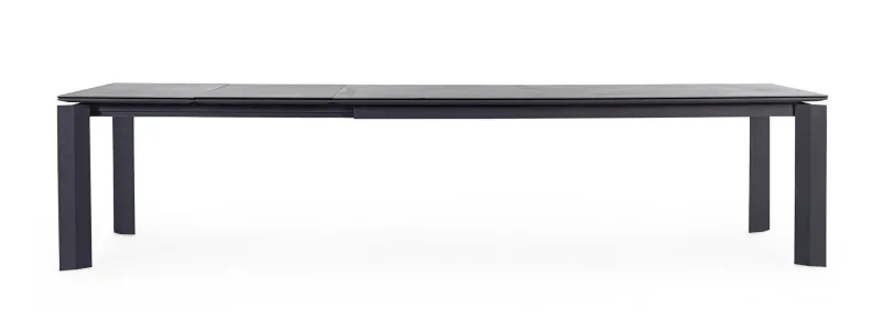 STRUTTURA IN ALLUMINIO VERNICIATO A POLVERE (POLIESTERE). PIANO IN CERAMICA (CON BASE IN VETRO) SPESSORE TOTALE 9MM. ALLUNGABILE CON APERTURA TELESCOPICA. PROLUNGHE ESTERNE CON ALLOGGIO SOTTO IL PIANO. VITERIA IN ACCIAIO INOSSIDABILE. GAMBE DA ASSEMBLARE.