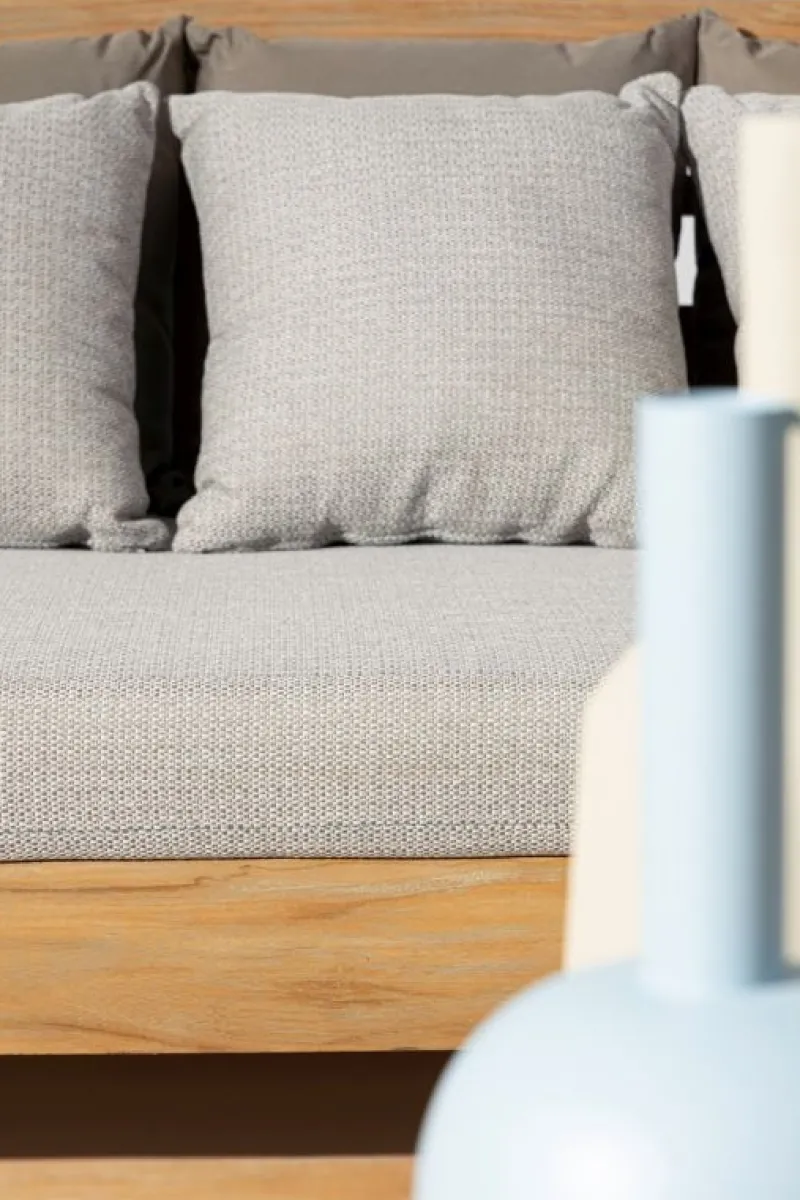 LEGNO TEAK FSC 100%, FINITURA SABBIATA ED ANTICATA A BASE D’ACQUA. CUSCINI SFODERABILI IN TESSUTO IDROREPELLENTE SUNPROOF OLEFIN (100% POLIPROPILENE). SI RACCOMANDA DI NON ESPORRE L’ARTICOLO ALLA LUCE DIRETTA DEL SOLE ED ALLE INTEMPERIE. QUESTO PRODOTTO È CARATTERIZZATO DALLA PRESENZA DI TASSELLI IN LEGNO DELLA STESSA NATURA. EVENTUALI FESSURE, CREPE O IMPERFEZIONI,
