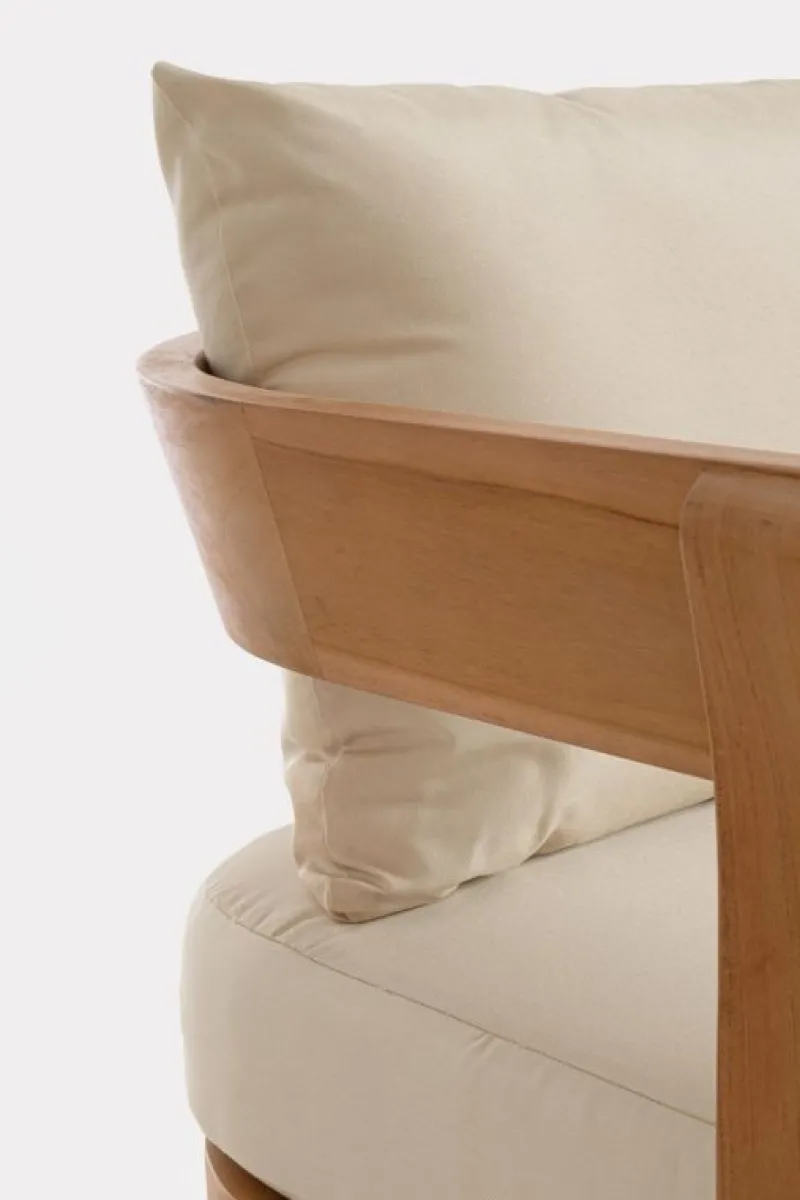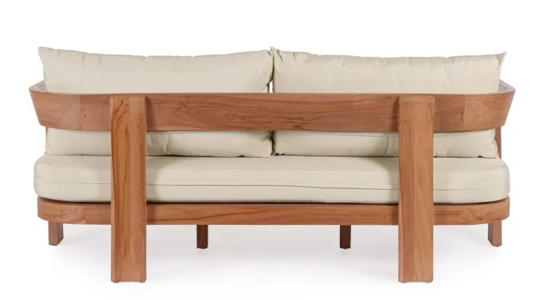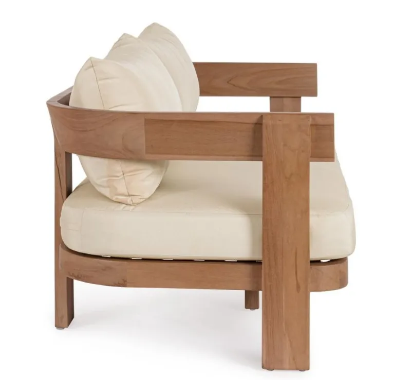 STRUTTURA IN IN TEAK – SVLK (LEGNO CERTIFICATO PROVENIENTE DA FORESTE SOSTENIBILI), FINITURA FINALE A BASE D’ACQUA. CUSCINI SFODERABILI IN TESSUTO IDROREPELLENTE SUNPROOF OLEFIN (100%POLYPROPYLENE). IL TEAK È UN LEGNO RICCO DI OLII. CON IL PASSARE DEL TEMPO, QUESTI OLII, PER UN PROCESSO NATURALE, RISALGONO IN SUPERFICIE E POSSONO MACCHIARE EVENTUALI CUSCINI A DIRETTO CONTATTO CON IL LEGNO.