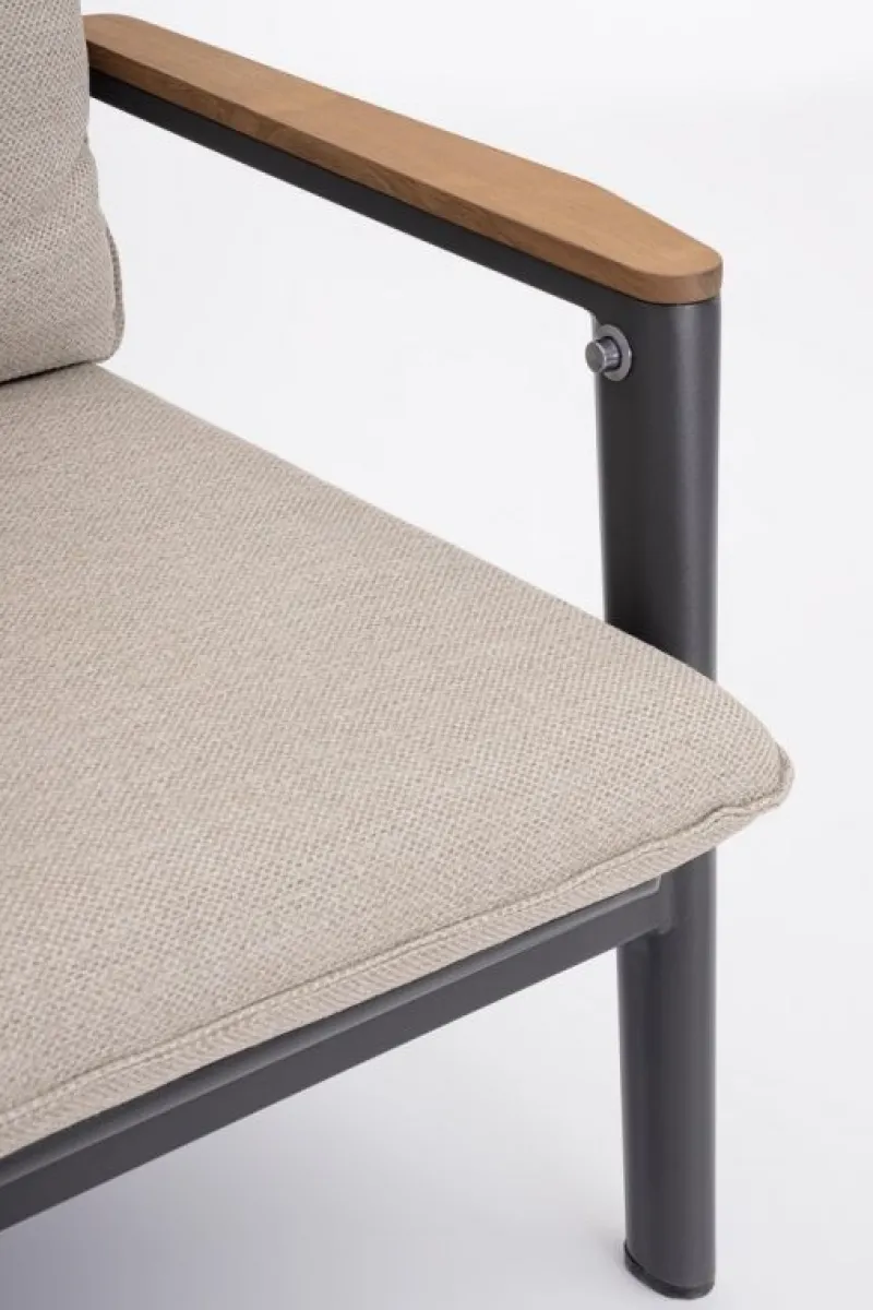 STRUTTURA IN ALLUMINIO VERNICIATA A POLVERE (POLIESTERE). BRACCIOLI CON INSERTI IN TEAK. SCHIENALI (CON INTRECCIO IN CORDA OLEFIN) RECLINABILI IN LIBERA POSIZIONE E SEDUTE IN TEXTILENE 1X1. CUSCINI SFODERABILI CON TESSUTO IDROREPELLENTE OLEFIN (100% POLIPROPILENE). VITERIA IN ACCIAIO INOSSIDABILE. SCHIENALI DA INSERIRE.NON VENDIBILE IN GERMANIA, AUSTRIA, SVIZZERA, PAESI BASSI E LUSSEMBURGO.
