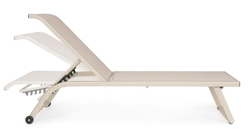 STRUTTURA IN ALLUMINIO, VERNICIATO A POLVERE (POLIESTERE). SEDUTA E SCHIENALE RIVESTITI IN TEXTILENE 2X1 (610G/M2). SCHIENALE RECLINABILE (4 POSIZIONI). VITERIA IN ACCIAIO GALVANIZZATO. RUOTE DA ASSEMBLARE IN PLASTICA (PU).