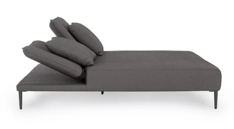 STRUTTURA IN ALLUMINIO. SEDUTA E SCHIENALE (RECLINABILE IN LIBERA POSIZIONE) NON SFODERABILI IN TESSUTO PER ESTERNO IN OLEFIN (100% POLIPROPILENE, 285GR/M2), IDROREPELLENTE E RESISTENTE AI RAGGI UV (GRADO 7), IMPERMEABILIZZATO INTERNAMENTE CON RIVESTIMENTO IN TESSUTO (POLIURETANO). IMBOTTITURA IN SCHIUMA POLIURETANICA, DENSITA’ 40KG/M3. INCLUSO DI
