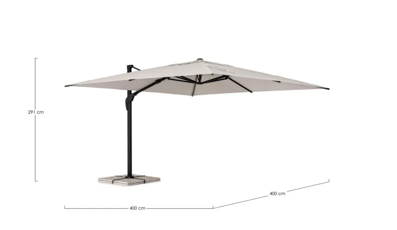 STRUTTURA IN ALLUMINIO VERNICIATA A POLVERE (POLIESTERE). PALO 102×65.5MM. 8 STECCHE 30X18.5MM. TELO COLOR NATURALE IN POLIESTERE 250GR/M2 CON RIVESTIMENTO IN PA (POLIAMMIDE) CON CAMINO ANTIVENTO. BASE A CROCE IN ACCIAIO. PALO GIREVOLE 360° MANUALMENTE. INCLINAZIONE VERTICALE CON IMPUGNATURA A 6 POSIZIONI. DOTATO DI SISTEMA PER INCLINAZIONE OMBRELLO DESTRA-SINISTRA. COMPRENSIVO DI