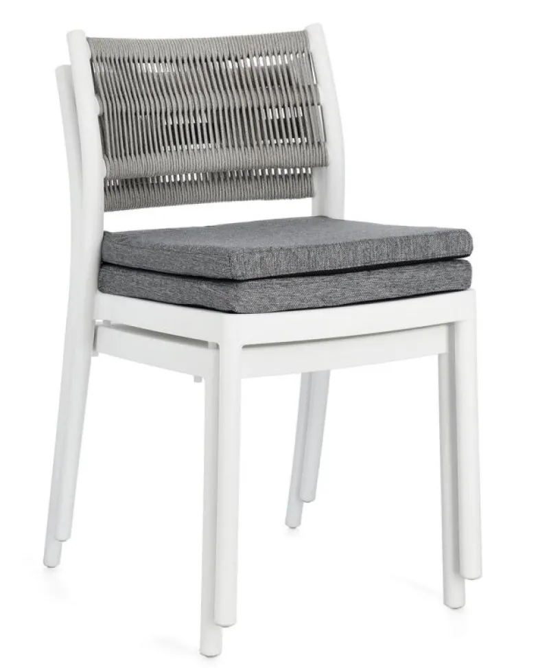 POLIPROPILENE (PP), RESISTENTE AI RAGGI UV. SCHIENALE CON INTRECCIO IN CORDA DI POLIESTERE. CUSCINO SEDUTA SFODERABILE CON TESSUTO IDROREPELLENTE POLIESTERE. IMPILABILE.
