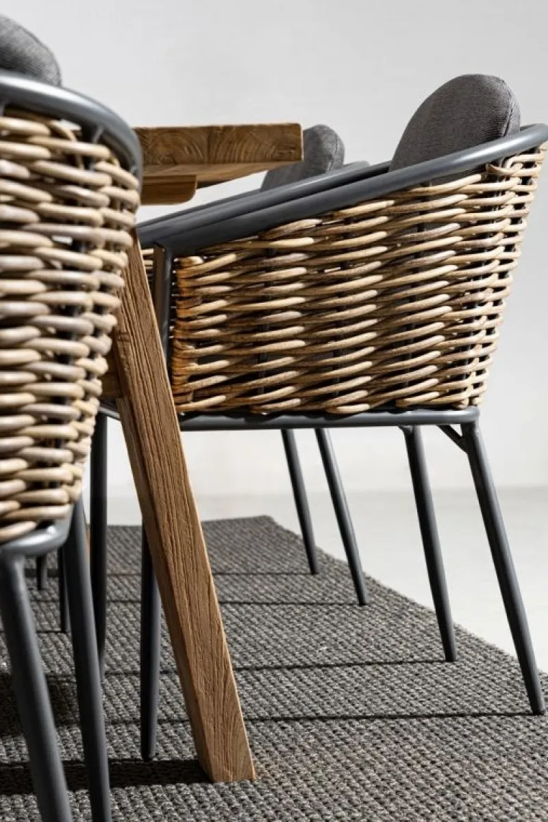 STRUTTURA E GAMBE IN ALLUMINIO VERNICIATE A POLVERE (POLIESTERE). SEDUTA RIVESTITA IN FIBRA SINTETICA (TONDA 9MM). CUSCINI SEDUTA E SCHIENALE SFODERABILI CON TESSUTO IDROREPELLENTE OLEFIN (100% POLIPROPILENE). IMPILABILE.