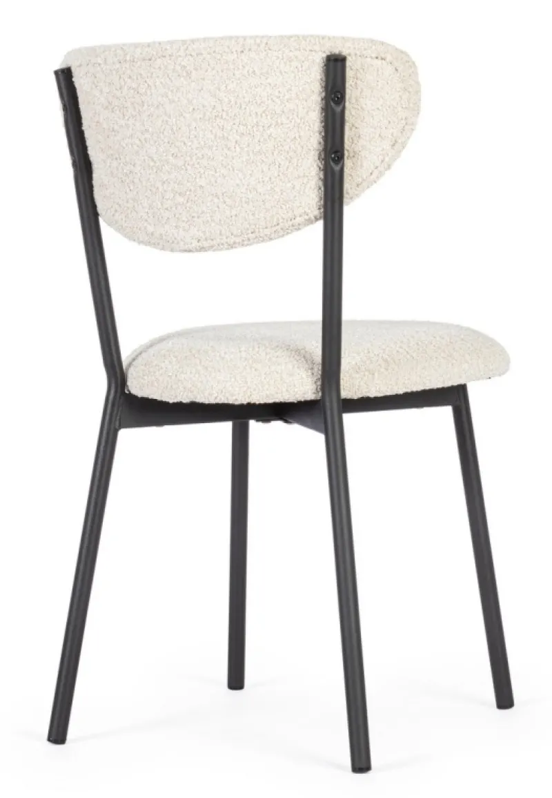 STRUTTURA IN ACCIAIO VERNICIATA A POLVERE EPOSSIDICA. SEDUTA E SCHIENALE IN COMPENSATO CON RIVESTIMENTO IN POLIESTERE, EFFETTO BOUCLE’. IMBOTTITURA IN SCHIUMA POLIURETANICA (DENSITA’ 25KG/M3). DA ASSEMBLARE.