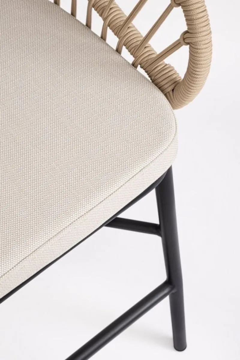 STRUTTURA IN ALLUMINIO VERNICIATA A POLVERE (POLIESTERE). INTRECCIO PER ESTERNO IN CORDA (POLIESTERE). CUSCINI SFODERABILI CON TESSUTO IDROREPELLENTE OLEFIN (100% POLIPROPILENE). IMPILABILE. IMBALLO SENZA CARTONE.