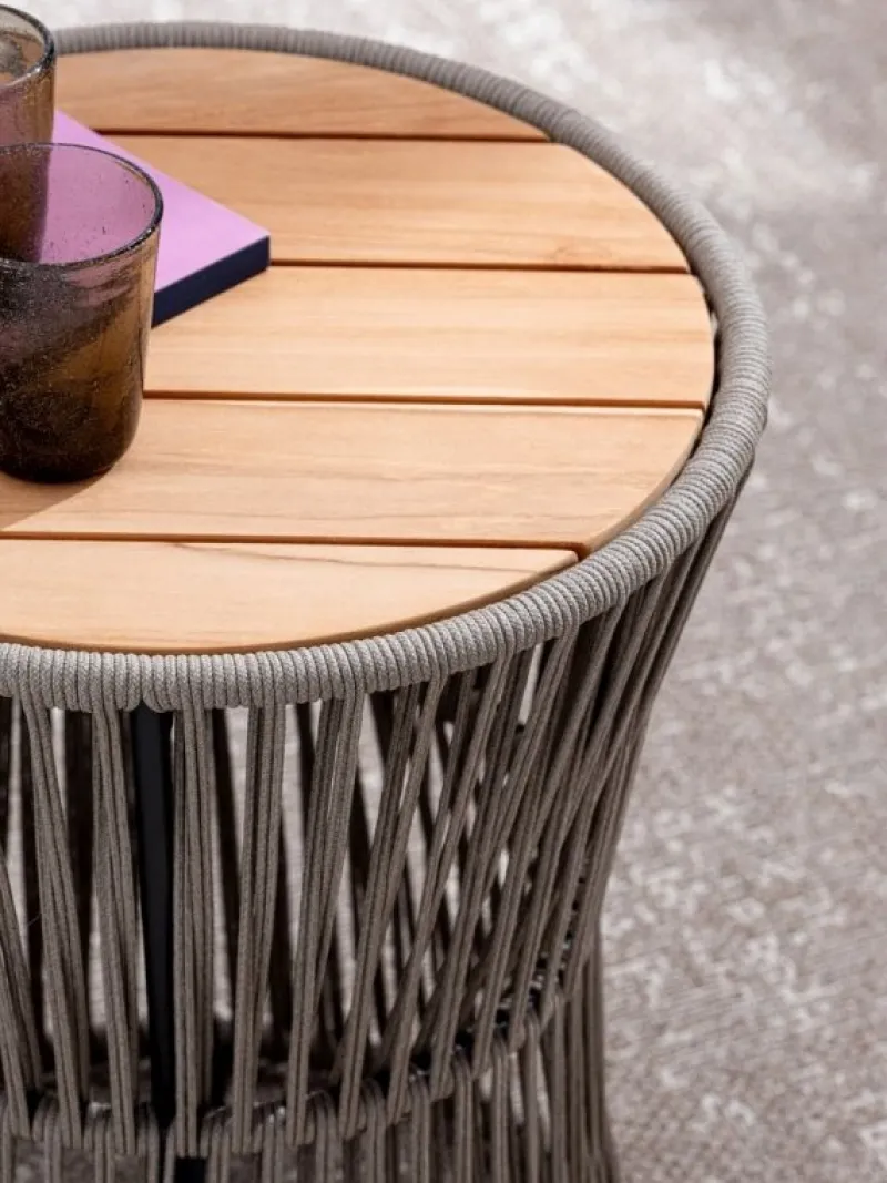 STRUTTURA IN ACCIAIO INOSSIDABILE (201). INTRECCIO PER ESTERNO IN CORDA (POLIPROPILENE). PIANO IN TEAK – SVLK (LEGNO CERTIFICATO PROVENIENTE DA FORESTE SOSTENIBILI).