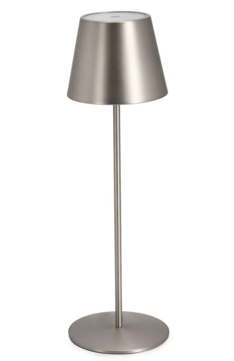 METALLO TRATTATO CON ELETTROPLACCATURA, LAMPADA LED, BATTERIA RICARICABILE CON CAVO USB 1 MT INCLUSO. TASTO ON/OFF TOUCH. PER USO INTERNO ED ESTERNO, IP54.
