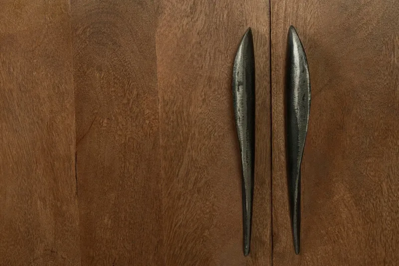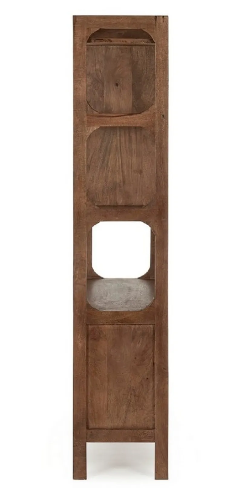 STRUTTURA E GAMBE IN LEGNO DI MANGO CON FINITURA A BASE D’ACQUA. SCHIENALE IN COMPENSATO. VANO PORTA COMPRENSIVO DI MENSOLA. MANIGLIE IN ACCIAIO.