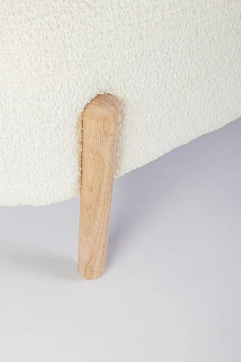 STRUTTURA IN COMPENSATO. GAMBE IN LEGNO RUBBER WOOD. RIVESTIMENTO SEDUTA IN POLIESTERE, EFFETTO BOUCLE’. IMBOTTITURA IN SCHIUMA POLIURETANICA (DENSITA’ 25KG/M3). GAMBE DA ASSEMBLARE.