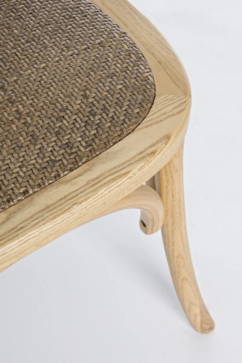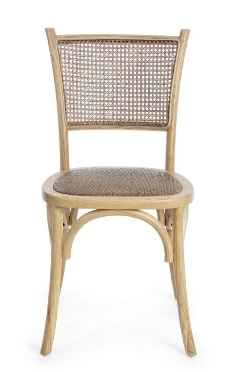 STRUTTURA IN LEGNO DI OLMO, SCHIENALE E SEDUTA IMBOTTITA RIVESTITE IN RATTAN NATURALE, FINITURA POLIURETANICA. IMBALLO SENZA CARTONE.