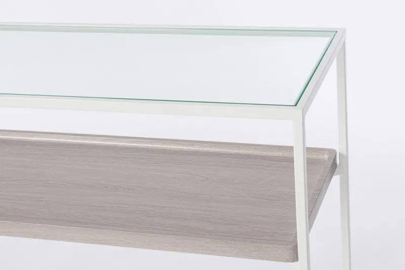 STRUTTURA IN ACCIAIO VERNICIATO A POLVERE EPOSSIDICA. PIANO SUPERIORE IN VETRO TEMPERATO, PIANO INFERIORE IN MDF IMPIALLACCIATO PVC.