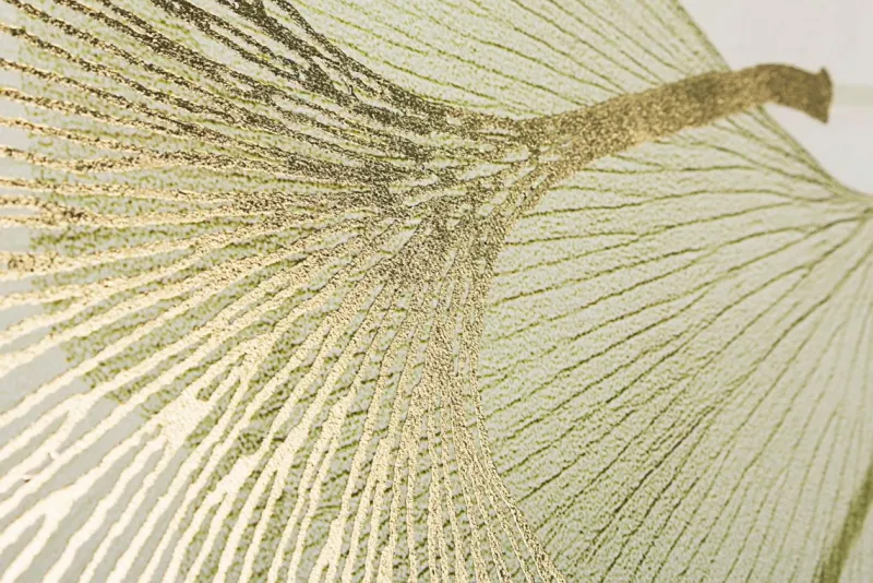 STAMPA DIPINTA A MANO SU TELA CON APPLICAZIONI FOGLI DORATI, LEGNO DI PINO.