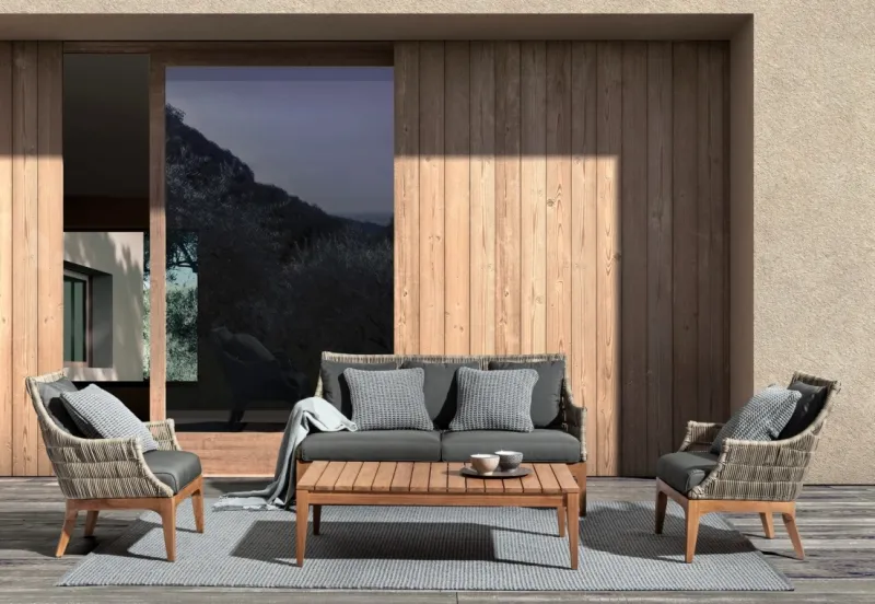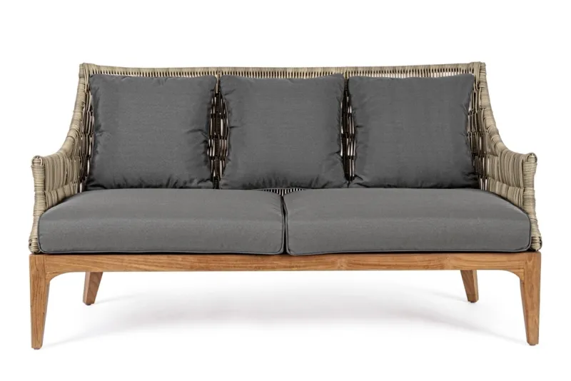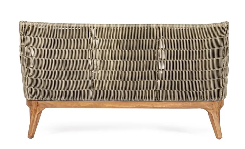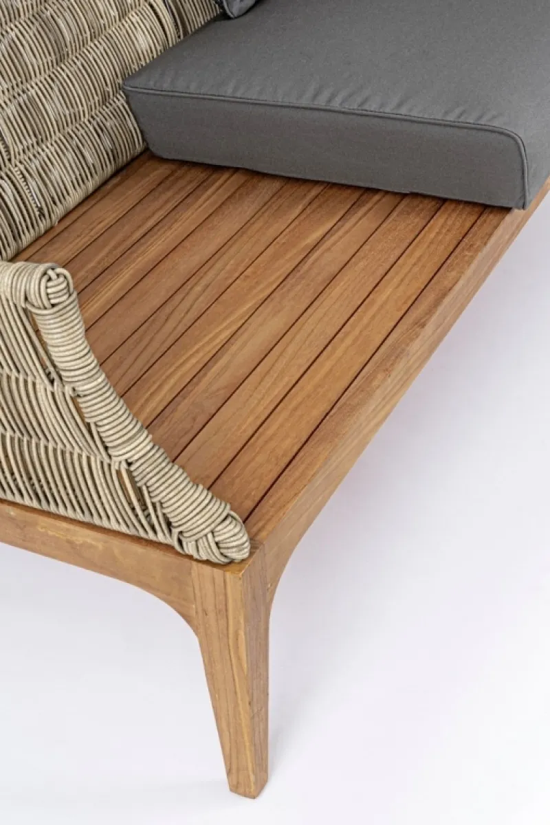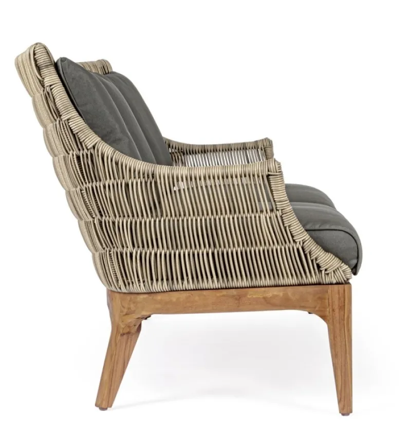 STRUTTURA SCHIENALE IN ALLUMINIO VERNICIATO A POLVERE (POLIESTERE). SEDUTA E GAMBE IN TEAK – SVLK (LEGNO CERTIFICATO PROVENIENTE DA FORESTE SOSTENIBILI). INTRECCIO PER ESTERNO IN FIBRA SINTETICA TONDA 5MM. CUSCINI SFODERABILI IN TESSUTO SUNPROOF OLEFIN (100% POLIPROPILENE). IMBOTTITURA PER ESTERNO QUICK DRY FOAM (ANTIUMIDITA’).