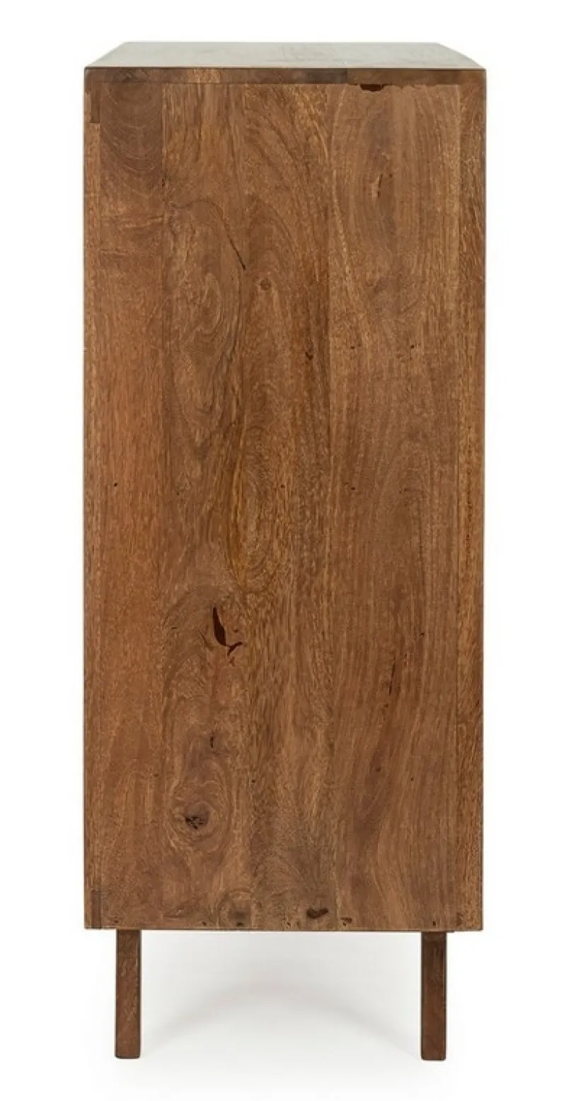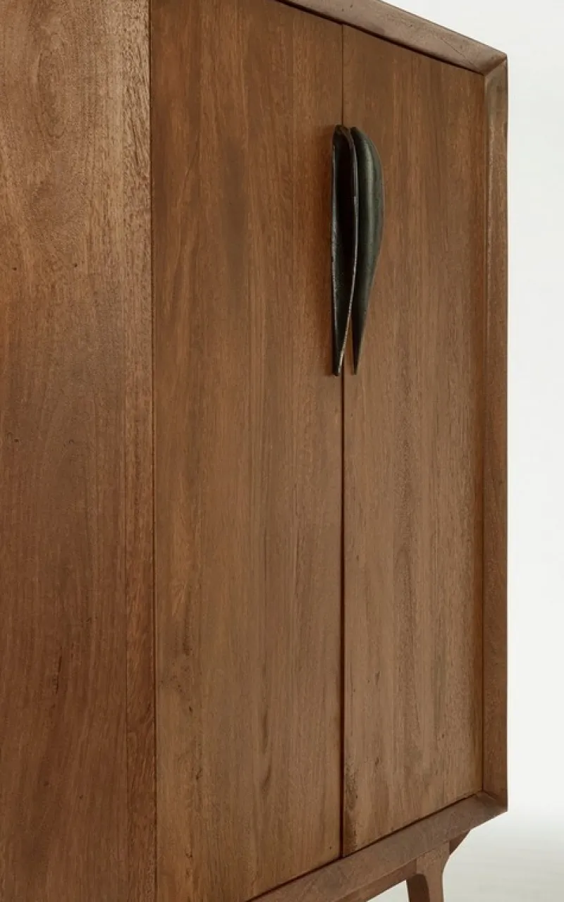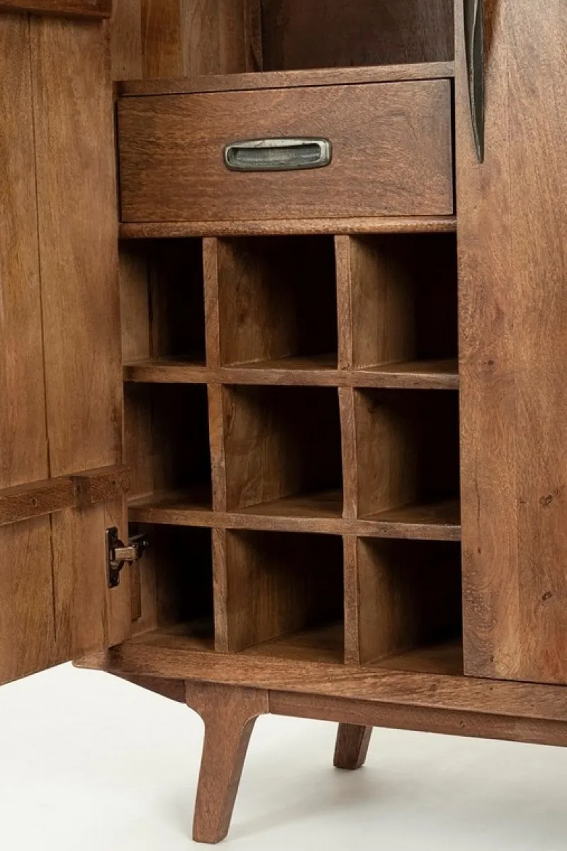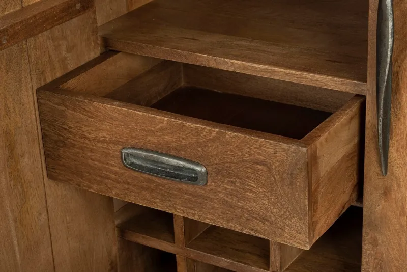STRUTTURA E GAMBE IN LEGNO DI MANGO CON FINITURA A BASE D’ACQUA. SCHIENALE IN COMPENSATO. VANO PORTA COMPRENSIVO DI MENSOLA, CASSETTO E PORTABOTTIGLIE. MANIGLIE IN ACCIAIO. GAMBE DA ASSEMBLARE.