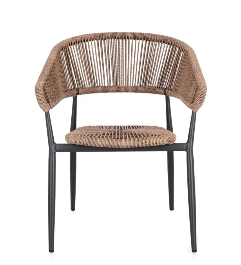 STRUTTURA IN ALLUMINIO, VERNICIATA A POLVERE (POLIESTERE), INTRECCIO IN FIBRA SINTETICA (TWISTED). IMPILABILE. IMBALLO SENZA CARTONE.