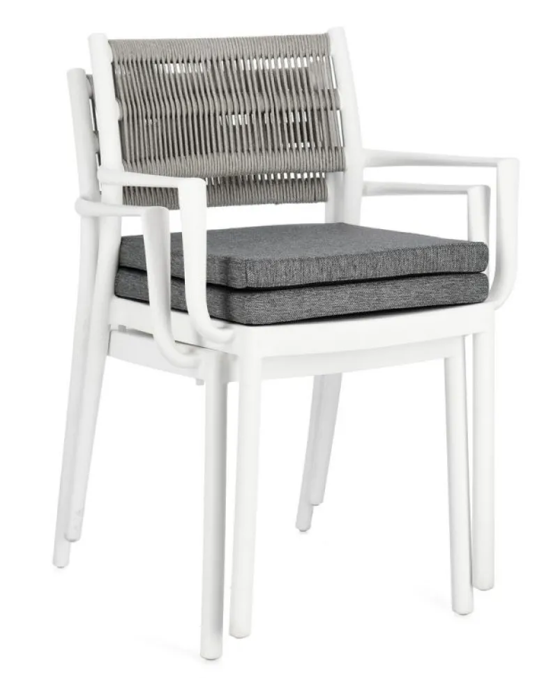 POLIPROPILENE (PP), RESISTENTE AI RAGGI UV. SCHIENALE CON INTRECCIO IN CORDA DI POLIESTERE. CUSCINO SEDUTA SFODERABILE CON TESSUTO IDROREPELLENTE POLIESTERE. IMPILABILE.