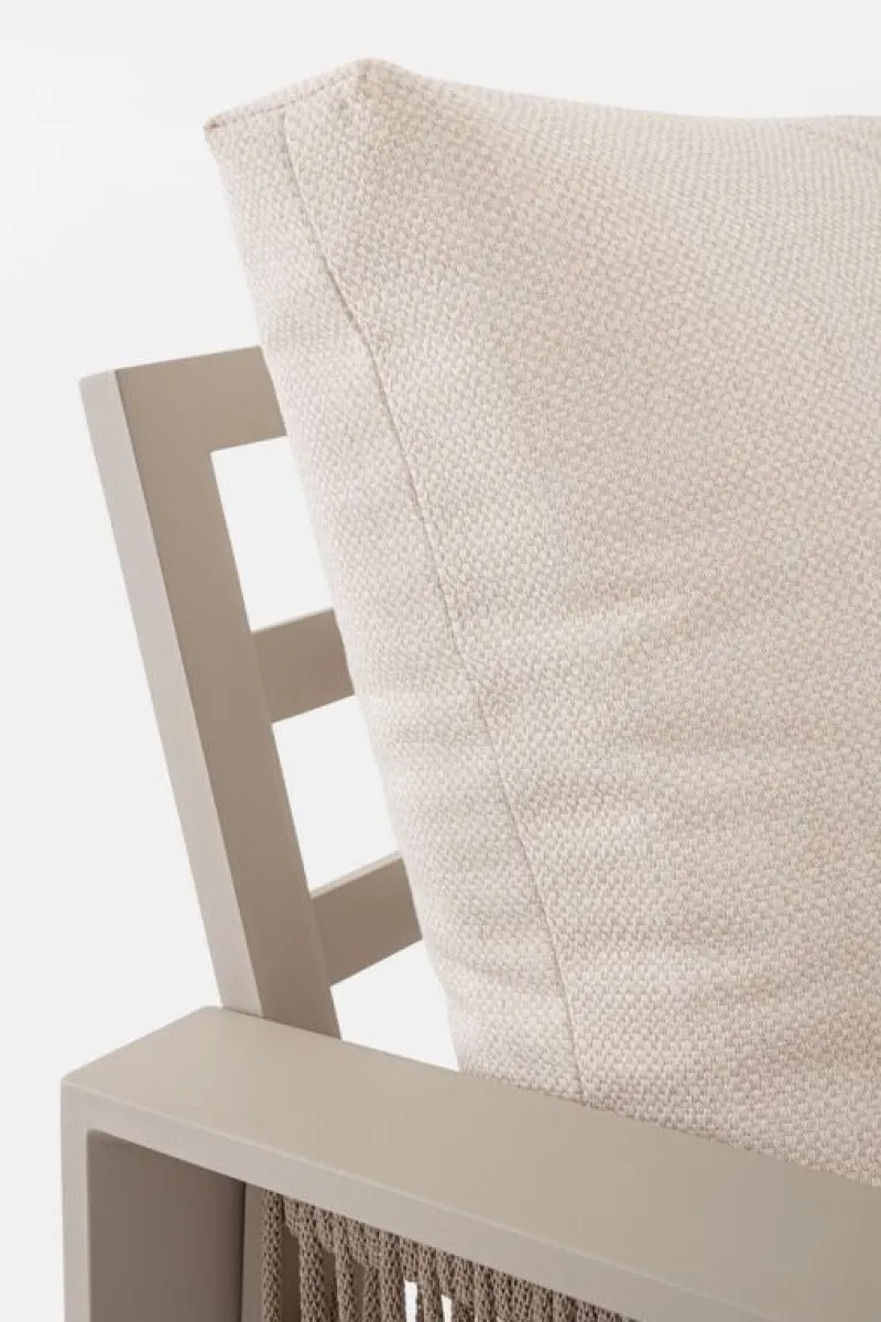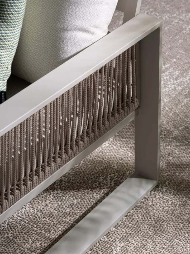 STRUTTURA IN ALLUMINIO, VERNICIATO A POLVERE (POLIESTERE). SEDUTA IN TEXTILENE. INTRECCIO CON CORDE IN TEXTILENE (5MM). CUSCINI SFODERABILI CON TESSUTO IDROREPELLENTE SPUN POLY (POLIESTERE). PIEDINI REGOLABILI. DA ASSEMBLARE.