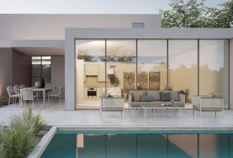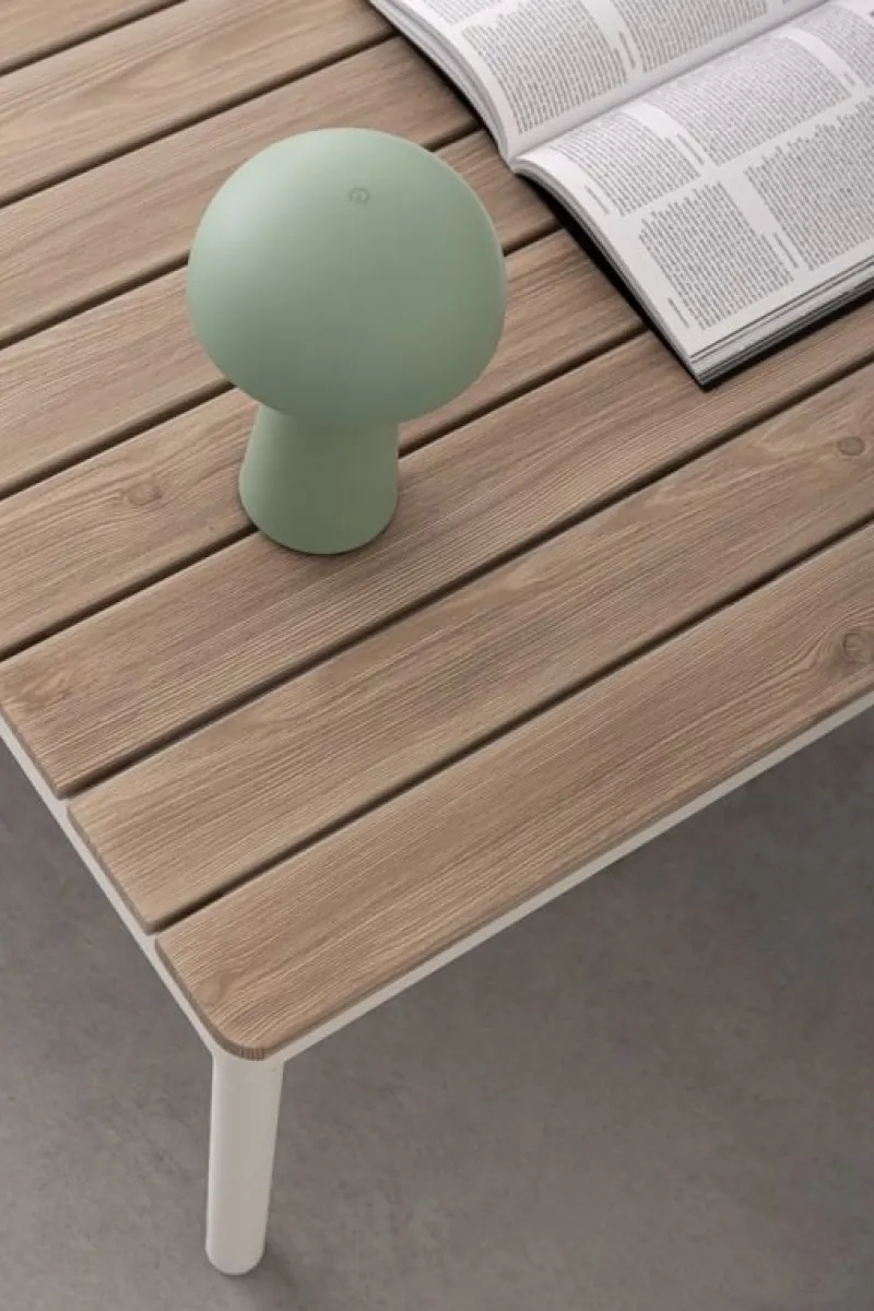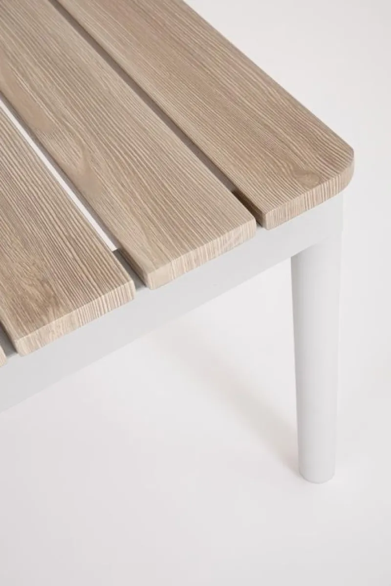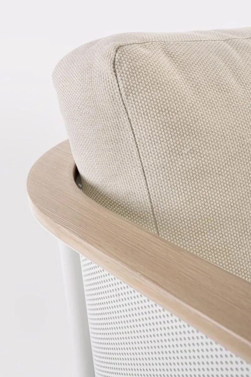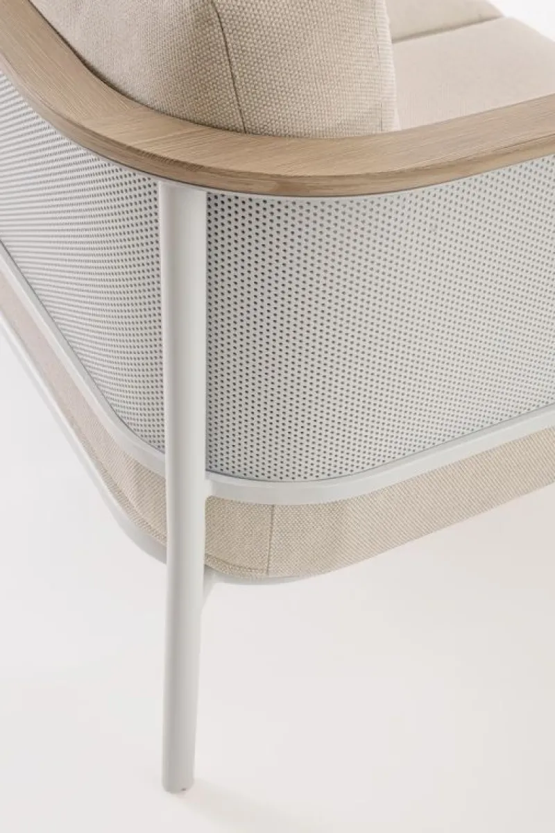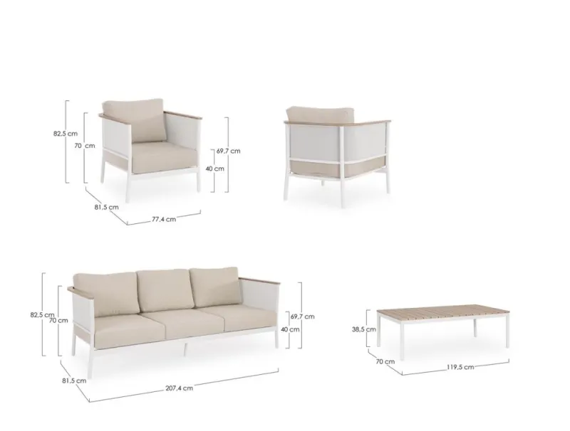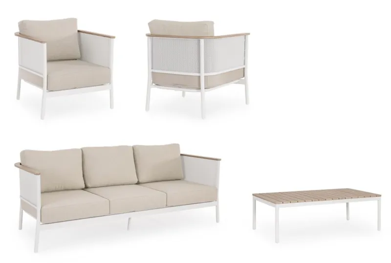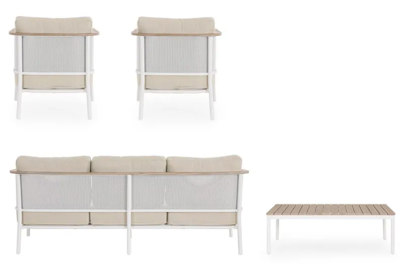STRUTTURA IN ALLUMINIO VERNICIATO A POLVERE (POLIESTERE). BRACCIOLI E PIANO TAVOLINO IN ALLUMINIO CON VERNICIATURA EFFETTO LEGNO. CUSCINI SEDUTA E SCHIENALE SFODERABILI CON TESSUTO IDROREPELLENTE OLEFIN (100% POLIPROPILENE). GAMBE TAVOLINO (VITERIA IN ACCIAIO INOSSIDABILE) DA ASSEMBLARE.