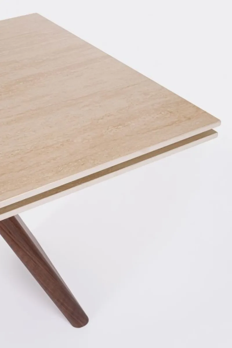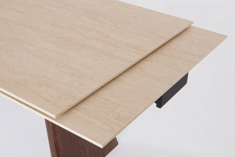 PIANO IN GRES PORCELLANATO CON EFFETTO TRAVERTINO. SUPPORTO PIANO IN ACCIAIO VERNICIATO A POLVERE EPOSSIDICA. GAMBE IN LEGNO DI BETULLA IMPIALLACCIATO LEGNO DI NOCE. PROLUNGHE INDIPENDENTI. PIEDINI REGOLABILI. GAMBE DA ASSEMBLARE.