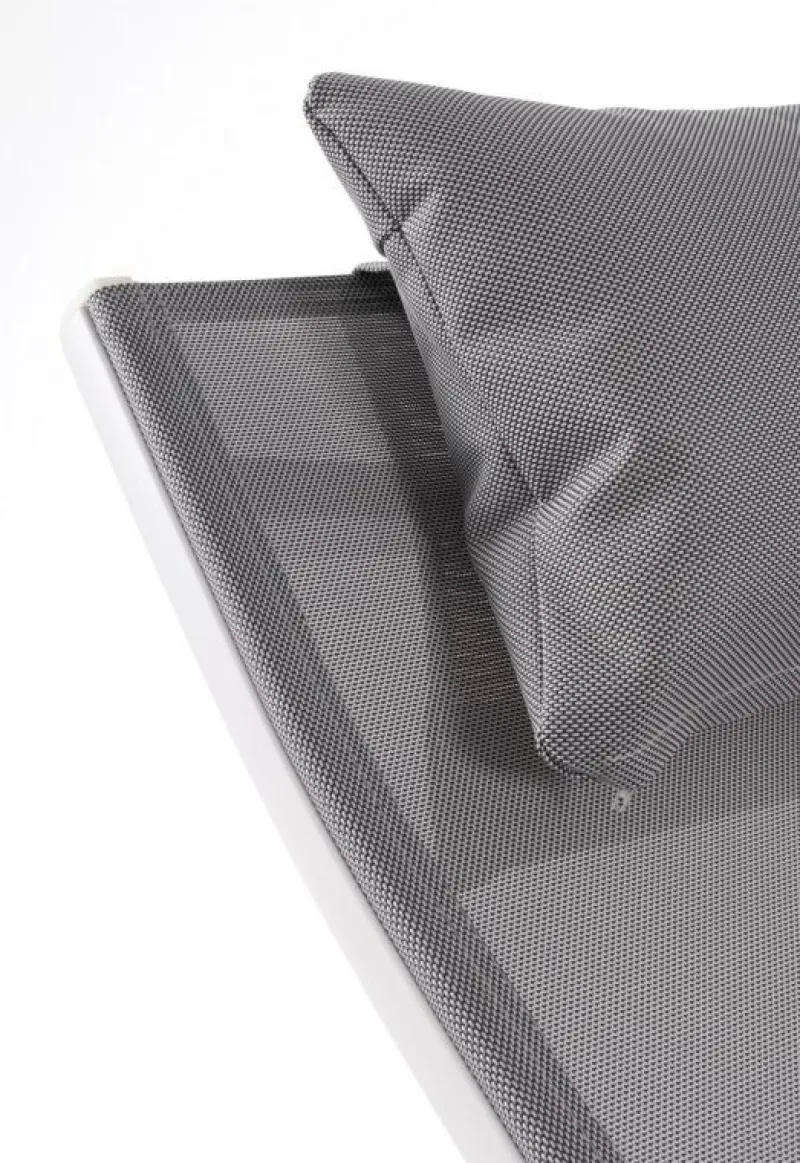 STRUTTURA IN ALLUMINIO VERNICIATA A POLVERE (POLIESTERE). RIVESTIMENTO IN TEXTILENE 1X1. SCHIENALE RECLINABILE IN 3 POSIZIONI. CUSCINO POGGIATESTA CON IMBOTTITURA PER ESTERNO FAST DRY FOAM, REMOVIBILE E SFODERABILE. VITERIA IN ACCIAIO INOSSIDABILE. DA ASSEMBLARE