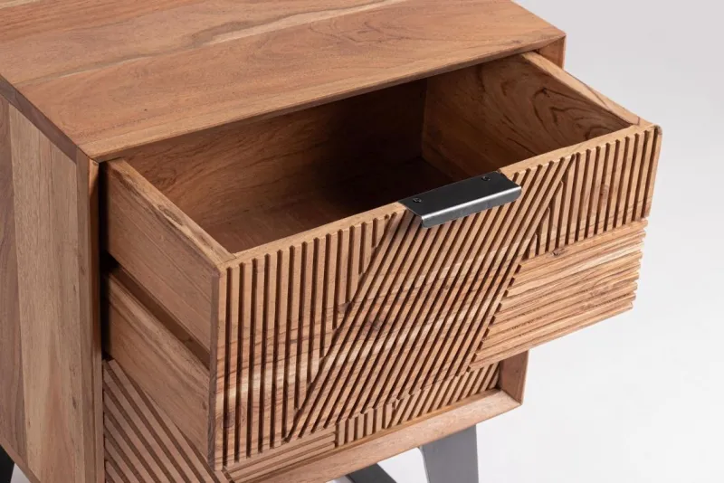 STRUTTURA IN LEGNO DI ACACIA, SCHIENALI E FONDO CASSETTI IN COMPENSATO. FRONTALI CASSETTI INTARSIATI E LAVORATI A MANO. FINITURA ACRILICA PROTETTIVA. MANIGLIE E GAMBE IN ACCIAIO. GAMBE DA ASSEMBLARE.
