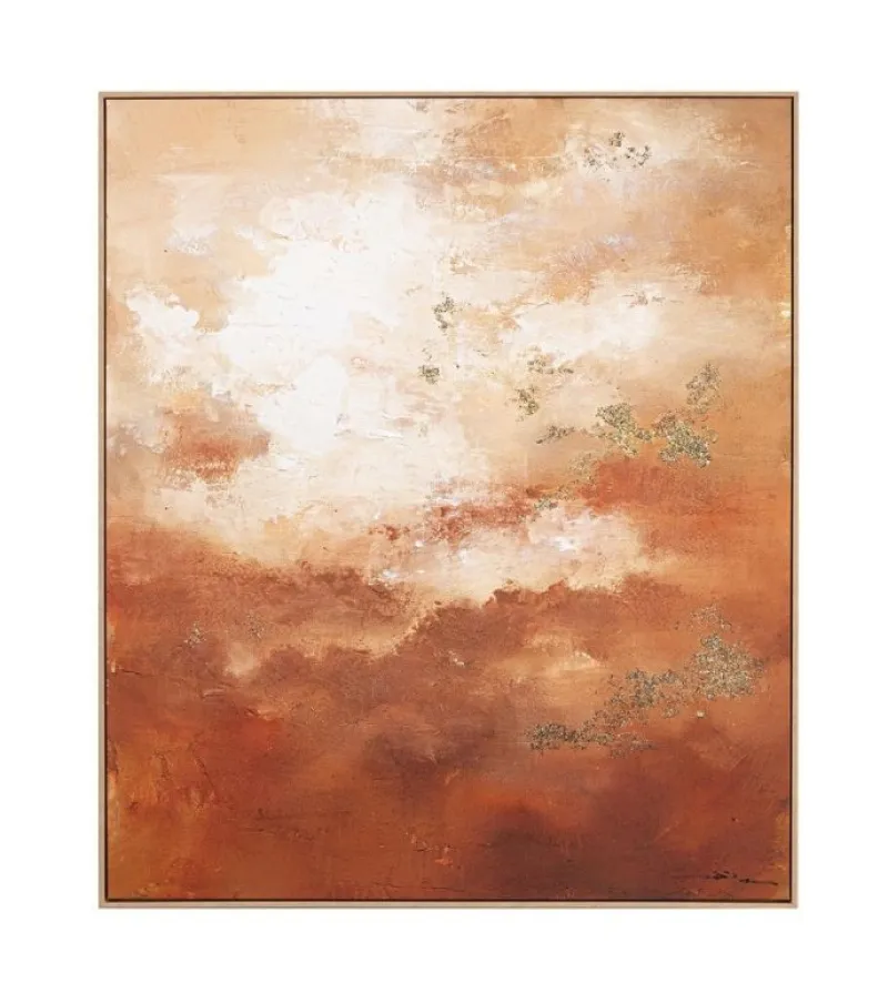STAMPA SU TELA DIPINTA A MANO CON APPLICAZIONI FOGLI DORATI. CORNICE IN PLASTICA. TELAIO IN MDF.