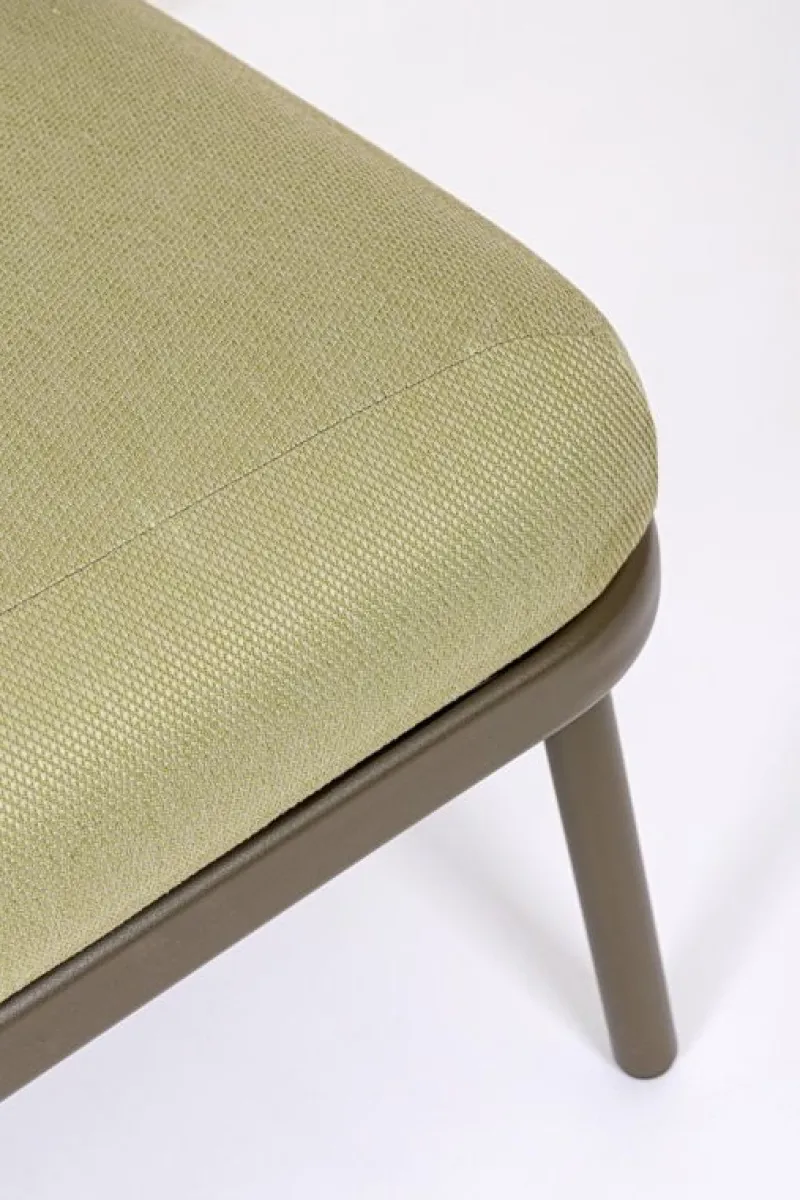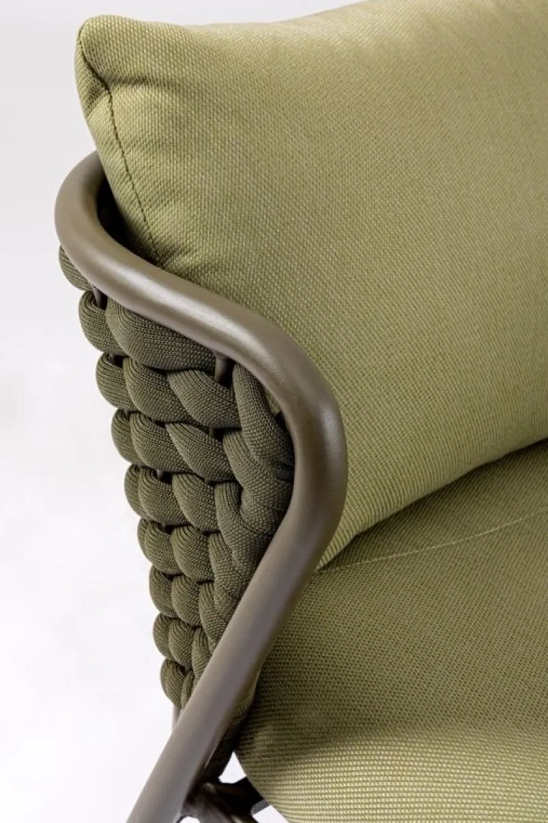 STRUTTURA IN ALLUMINIO VERNICIATO A POLVERE (POLIESTERE). INTRECCIO IN CORDA DI TEXTILENE CON IMBOTTITURA IN GOMMA NITRILICA. CUSCINO SEDUTA E SCHIENALE SFODERABILE IN TESSUTO IDROREPELLENTE OLEFIN (100% POLIPROPILENE).